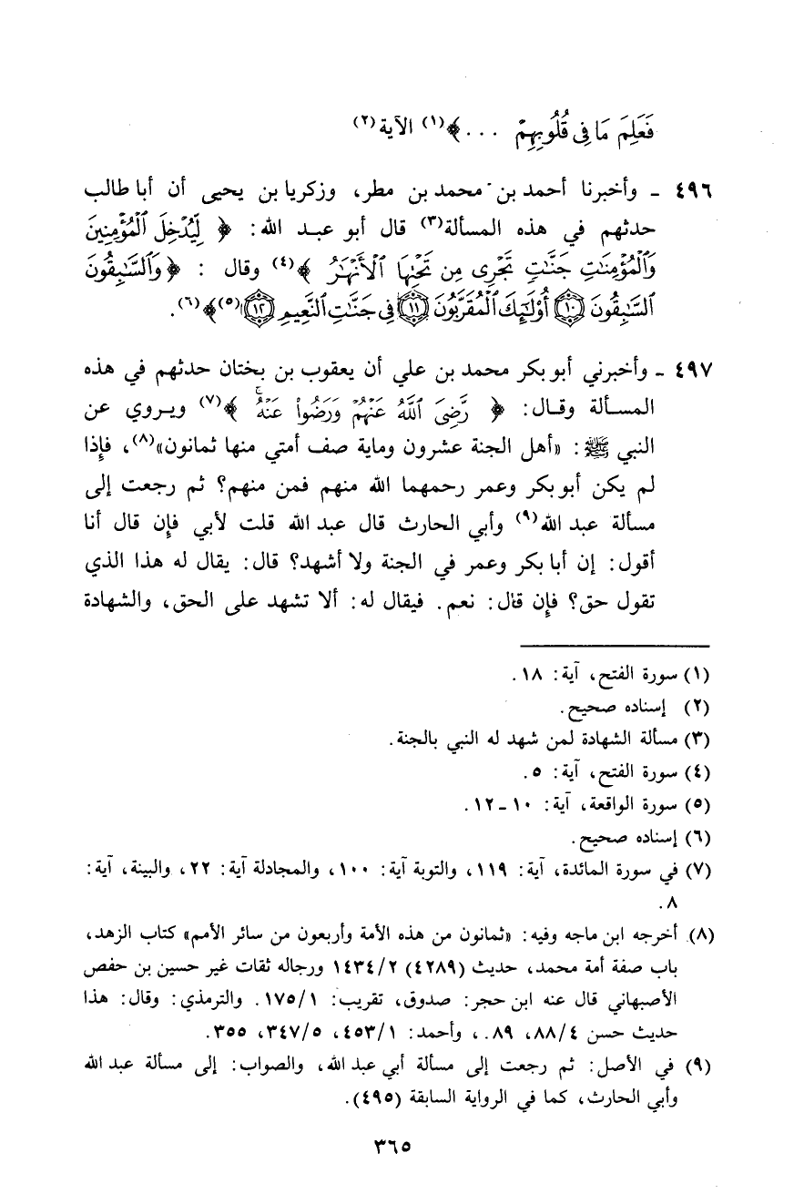497 - وَأَخْبَرَنِي أَبُو بَكْرٍ مُحَمَّدُ بْنُ عَلِيٍّ، أَنَّ يَعْقُوبَ بْنِ بُخْتَانَ حَدَّثَهُمْ فِي هَذِهِ الْمَسْأَلَةِ وَقَالَ: {رَضِيَ اللَّهُ عَنْهُمْ وَرَضُوا عَنْهُ} [المائدة: 119] ، وَيَرْوِي عَنِ النَّبِيِّ صَلَّى اللهُ عَلَيْهِ وَسَلَّمَ: «§أَهْلُ الْجَنَّةِ عِشْرُونَ وَمِائَةُ صَفٍّ، أُمَّتِي مِنْهَا ثَمَانُونَ» . فَإِذَا لَمْ يَكُنْ أَبُو بَكْرٍ وَعُمَرُ رَحِمَهُمَا اللَّهُ مِنْهُمْ فَمَنْ مِنْهُمْ؟ ثُمَّ رَجَعْتُ إِلَى مَسْأَلَةِ عَبْدِ اللَّهِ وَأَبِي الْحَارِثِ، قَالَ عَبْدُ اللَّهِ: قُلْتُ لِأَبِي: فَإِنْ قَالَ: أَنَا أَقُولُ: إِنَّ أَبَا بَكْرٍ وَعُمَرَ فِي الْجَنَّةِ، وَلَا أَشْهَدُ؟ قَالَ: " يُقَالَ لَهُ: هَذَا الَّذِي تَقُولُ حَقٌّ؟ فَإِنْ قَالَ: نَعَمْ، فَيُقَالَ لَهُ: أَلَا تَشْهَدُ عَلَى الْحَقِّ، وَالشَّهَادَةُ -[366]- هِيَ الْقَوْلُ، وَلَا يَشْهَدُ حَتَّى يَقُولَ، وَإِذَا قَالَ شَهِدَ، وَقَالَ النَّبِيُّ صَلَّى اللهُ عَلَيْهِ وَسَلَّمَ: أَهْلُ الْجَنَّةِ عِشْرُونَ وَمِائَةُ صَفٍّ، ثَمَانُونَ مِنْهَا مِنْ أُمَّتِي فَإِذَا لَمْ يَكُنْ أَصْحَابُ رَسُولِ اللَّهِ صَلَّى اللهُ عَلَيْهِ وَسَلَّمَ مِنْهُمْ فَمَنْ يَكُونُ؟