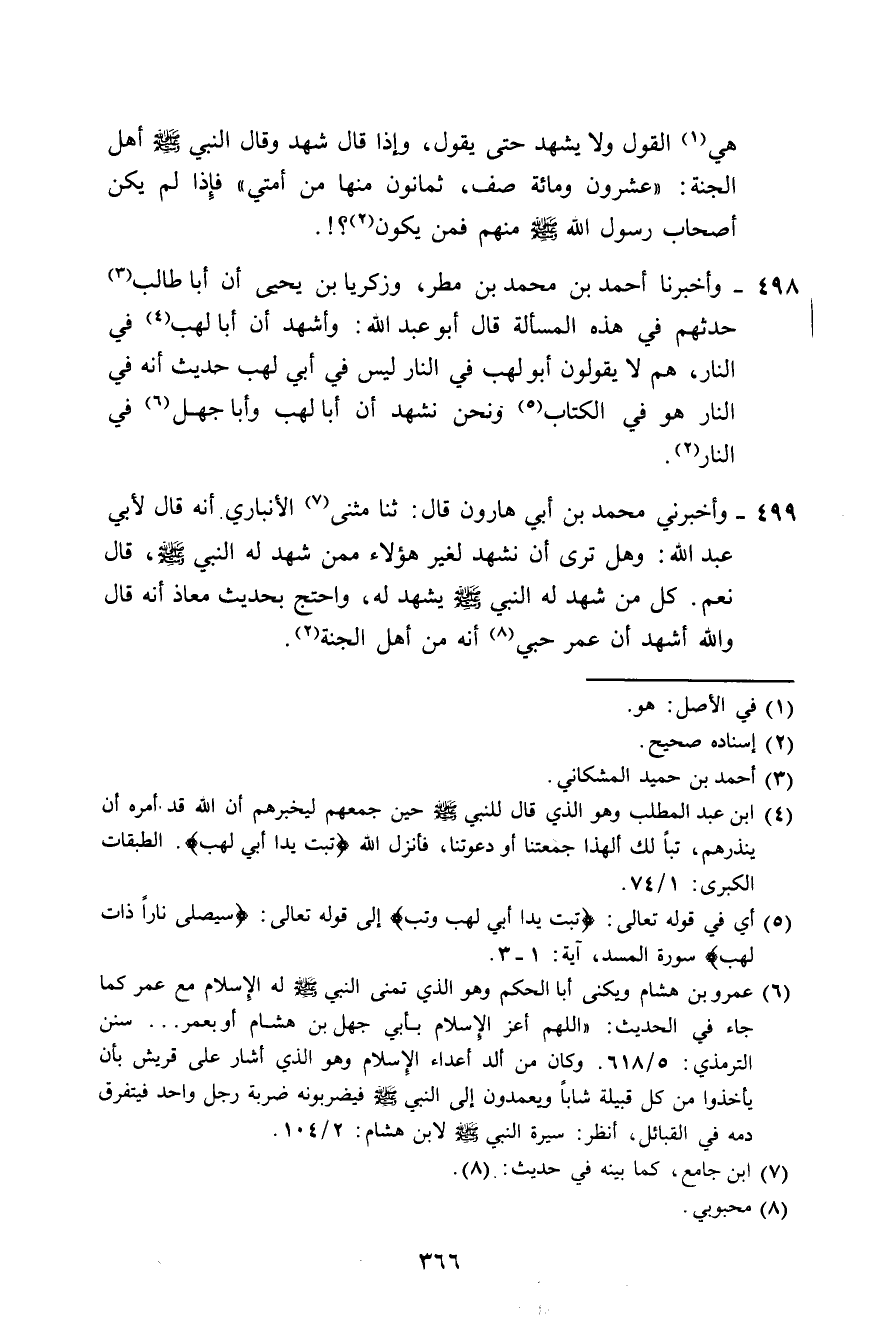498 - وَأَخْبَرَنَا أَحْمَدُ بْنُ مُحَمَّدِ بْنِ مَطَرٍ، وَزَكَرِيَّا بْنُ يَحْيَى، أَنَّ أَبَا طَالِبٍ حَدَّثَهُمْ فِي هَذِهِ الْمَسْأَلَةِ، قَالَ أَبُو عَبْدِ اللَّهِ: «§وَأَشْهَدُ أَنَّ أَبَا لَهَبٍ، فِي النَّارِ، هُمْ لَا يَقُولُونَ أَبُو لَهَبٍ فِي النَّارِ، لَيْسَ فِي أَبِي لَهَبٍ حَدِيثٌ أَنَّهُ فِي النَّارِ، هُوَ فِي الْكِتَابِ، وَنَحْنُ نَشْهَدُ أَنَّ أَبَا لَهَبٍ وَأَبَا جَهْلٍ فِي النَّارِ»