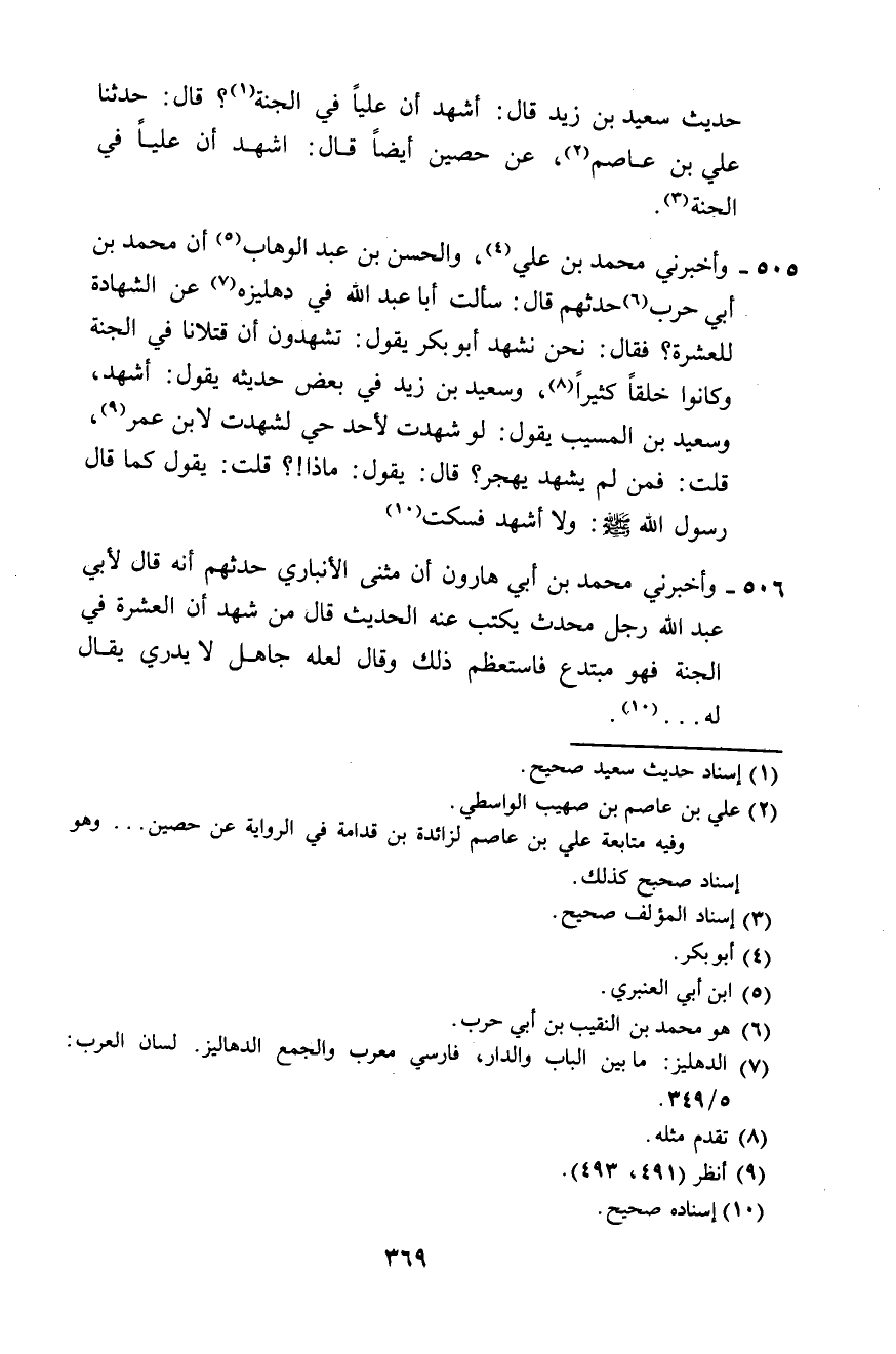 505 - وَأَخْبَرَنِي مُحَمَّدُ بْنُ عَلِيٍّ، وَالْحَسَنُ بْنُ عَبْدِ الْوَهَّابِ، أَنَّ مُحَمَّدَ بْنَ أَبِي حَرْبٍ حَدَّثَهُمْ قَالَ: سَأَلْتُ أَبَا عَبْدِ اللَّهِ فِي دِهْلِيزِهِ عَنِ الشَّهَادَةِ لِلْعَشَرَةِ؟ فَقَالَ: " §نَحْنُ نَشْهَدُ، أَبُو بَكْرٍ يَقُولُ: «تَشْهَدُونَ أَنَّ قَتْلَانَا فِي الْجَنَّةِ» ، وَكَانُوا خَلْقًا كَثِيرًا، وَسَعِيدُ بْنُ زَيْدٍ فِي بَعْضِ حَدِيثِهِ يَقُولُ: أَشْهَدُ، وَسَعِيدُ بْنُ الْمُسَيِّبِ يَقُولُ: لَوْ شَهِدْتُ لِأَحَدٍ حَيٍّ لَشَهِدْتُ لِابْنِ عُمَرَ، قُلْتُ: فَمَنْ لَمْ يَشْهَدْ يُهْجُرُ؟ قَالَ: يَقُولُ: مَاذَا؟ قُلْتُ: يَقُولُ كَمَا قَالَ رَسُولُ اللَّهِ صَلَّى اللهُ عَلَيْهِ وَسَلَّمَ: وَلَا أَشْهَدُ، فَسَكَتَ