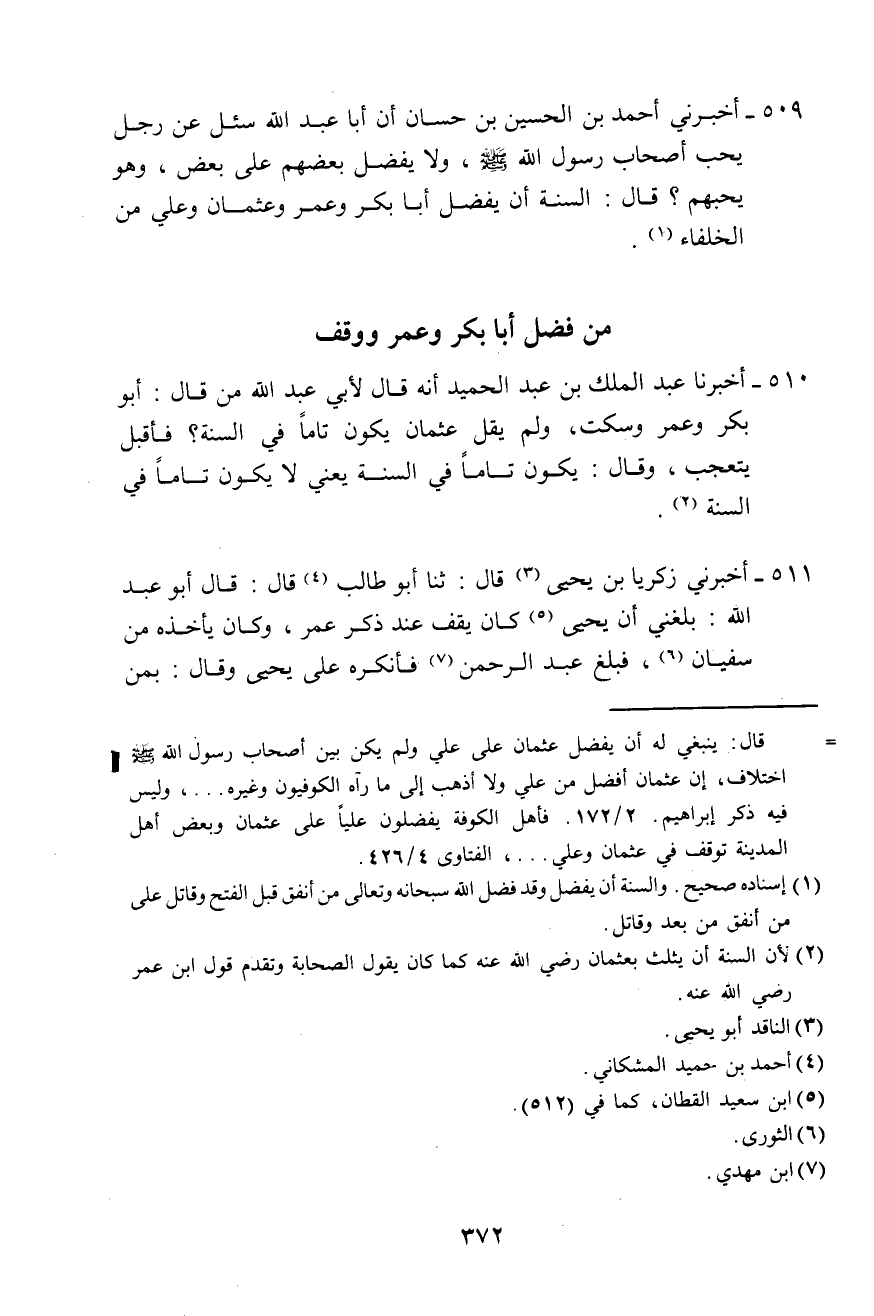 509 - أَخْبَرَنِي أَحْمَدُ بْنُ الْحُسَيْنِ بْنِ حَسَّانَ، أَنَّ أَبَا عَبْدِ اللَّهِ، سُئِلَ عَنِ رَجُلٍ يُحِبُّ أَصْحَابَ رَسُولِ اللَّهِ صَلَّى اللهُ عَلَيْهِ وَسَلَّمَ، وَلَا يُفَضِّلُ بَعْضَهُمْ عَلَى بَعْضٍ وَهُوَ يُحِبُّهُمْ؟ قَالَ: «§السُّنَّةُ أَنْ يُفَضِّلَ أَبَا بَكْرٍ وَعُمَرَ، وَعُثْمَانَ، وَعَلِيًّا مِنَ الْخُلَفَاءِ»