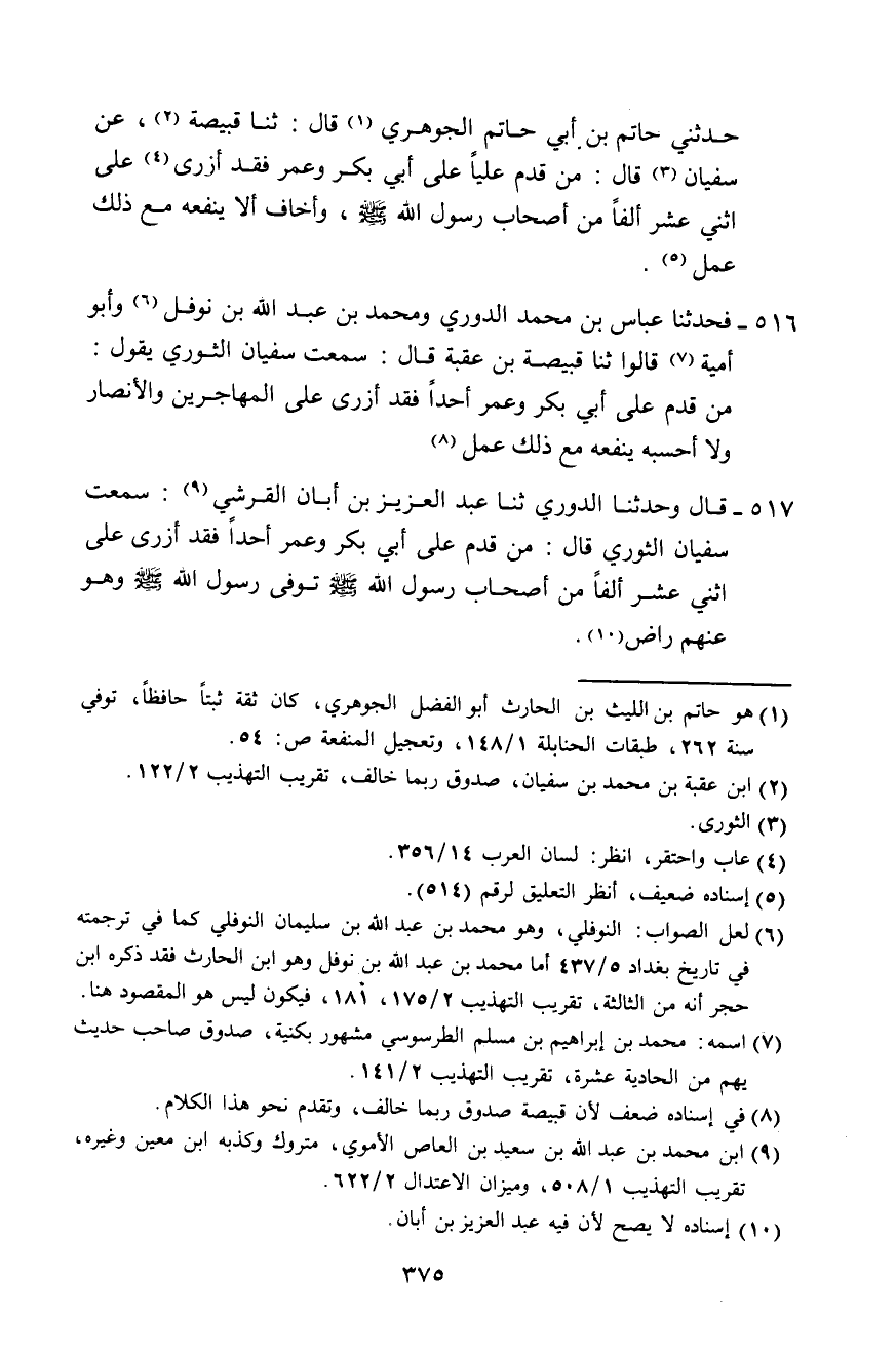 516 - فَحَدَّثَنَا عَبَّاسُ بْنُ مُحَمَّدٍ الدُّورِيُّ، وَمُحَمَّدُ بْنُ عَبْدِ اللَّهِ بْنِ نَوْفَلٍ، وَأَبُو أُمَيَّةَ، قَالُوا: ثَنَا قَبِيصَةُ بْنُ عُقْبَةَ، قَالَ: سَمِعْتُ سُفْيَانَ الثَّوْرِيَّ يَقُولُ: «§مَنْ قَدَّمَ عَلَى أَبِي بَكْرٍ وَعُمَرَ أَحَدًا فَقَدْ أَزْرَى عَلَى الْمُهَاجِرِينَ وَالْأَنْصَارِ، وَلَا أَحْسَبُهُ يَنْفَعُهُ مَعَ ذَلِكَ عَمَلٌ»