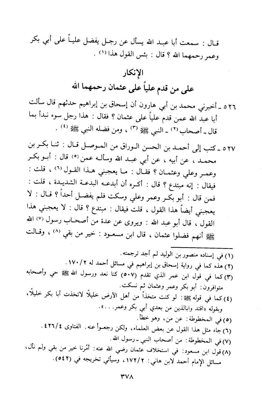 §526 - الْإِنْكَارُ عَلَى مَنْ قَدَّمَ عَلِيًّا عَلَى عُثْمَانَ رَحِمَهُمَا اللَّهُ