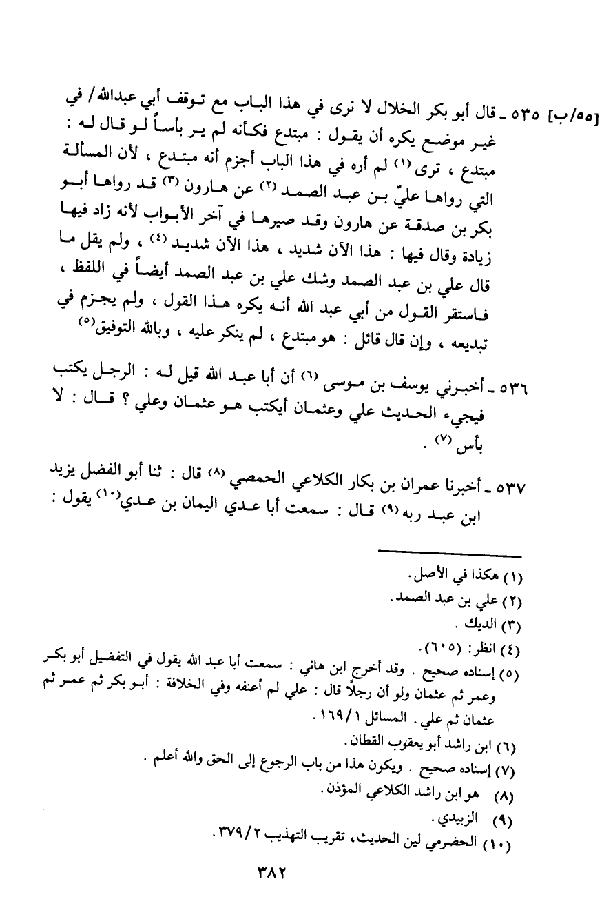 536 - أَخْبَرَنِي يُوسُفُ بْنُ مُوسَى، أَنَّ أَبَا عَبْدِ اللَّهِ، قِيلَ لَهُ: " §الرَّجُلُ يَكْتُبُ فَيَجِئُ الْحَدِيثُ عَلِيٌّ وَعُثْمَانُ، أَيَكْتِبُ هُوَ عُثْمَانُ وَعَلِيٌّ؟ قَالَ: لَا بَأْسَ "