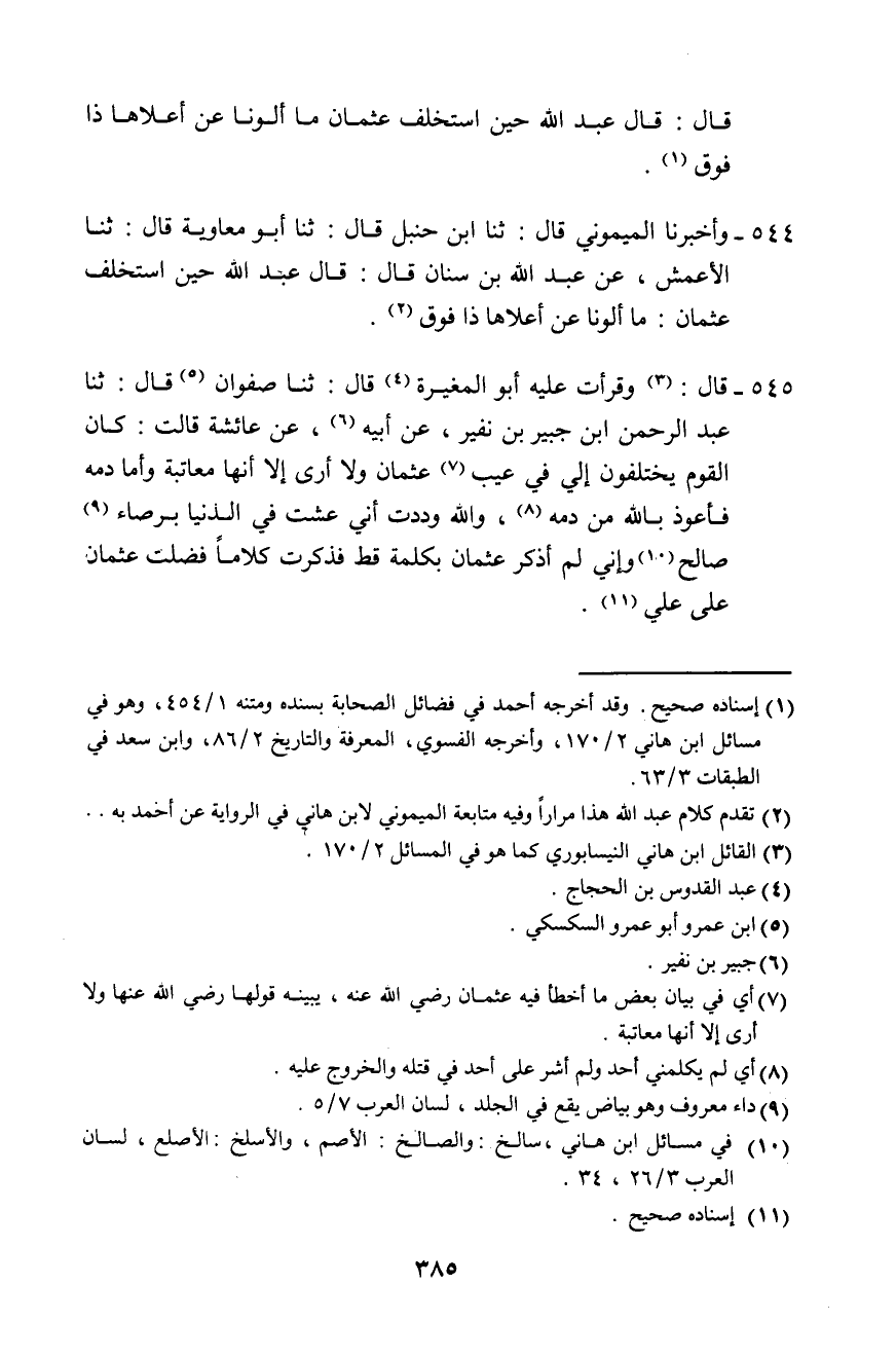 545 - قَالَ: وَقَرَأْتُ عَلَيْهِ: أَبُو الْمُغِيرَةِ قَالَ: ثَنَا صَفْوَانُ، قَالَ: ثَنَا عَبْدُ الرَّحْمَنِ بْنُ جُبَيْرِ بْنِ نُفَيْرٍ، عَنْ أَبِيهِ، عَنْ عَائِشَةَ، قَالَتْ: «§كَانَ الْقَوْمُ يَخْتَلِفُونَ إِلَيَّ فِي عَيْبِ عُثْمَانَ، وَلَا أَرَى إِلَّا أَنَّهَا مُعَاتَبَةٌ، وَأَمَّا دَمُهُ، فَأَعُوذُ بِاللَّهِ مِنْ دَمِهِ، وَاللَّهِ وَدِدْتُ أَنِّي عِشْتُ فِي الدُّنْيَا بَرْصَاءَ صَالِخًا، وَإِنِّي لَمْ أَذْكُرْ عُثْمَانَ بِكَلِمَةٍ قَطُّ، فَذَكَرْتُ كَلَامًا فَضَّلْتُ عُثْمَانَ عَلَى عَلِيٍّ»