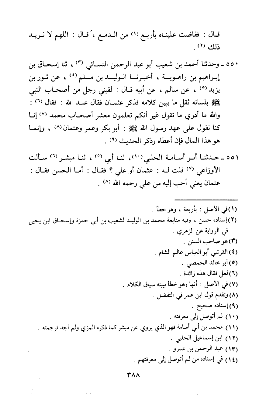 550 - وَحَدَّثَنَا أَحْمَدُ بْنُ شُعَيْبٍ أَبُو عَبْدِ الرَّحْمَنِ النَّسَائِيُّ، ثَنَا إِسْحَاقُ بْنُ إِبْرَاهِيمَ بْنِ رَاهَوَيْهِ، أَخْبَرَنَا الْوَلِيدُ بْنُ مُسْلِمٍ، عَنْ ثَوْرِ بْنِ يَزِيدَ، عَنْ سَالِمٍ، عَنْ أَبِيهِ، قَالَ: لَقِيَنِي رَجُلٌ مِنْ أَصْحَابِ النَّبِيِّ صَلَّى اللهُ عَلَيْهِ وَسَلَّمَ، بِلِسَانِهِ ثِقَلٌ، مَا يُبَيِّنُ كَلَامَهُ، فَذَكَرَ عُثْمَانَ فَقَالَ عَبْدُ اللَّهِ: فَقَالَ: وَاللَّهِ مَا أَدْرِي مَا تَقُولُ، غَيْرَ أَنَّكُمْ تَعْلَمُونَ مَعْشَرَ أَصْحَابِ مُحَمَّدٍ، إِنَّا §كُنَّا نَقُولُ عَلَى عَهْدِ رَسُولِ اللَّهِ صَلَّى اللهُ عَلَيْهِ وَسَلَّمَ: أَبُو بَكْرٍ، وَعُمَرُ وَعُثْمَانُ، وَإِنَّمَا هُوَ هَذَا الْمَالُ، فَإِنْ أَعْطَاهُ " وَذَكَرَ الْحَدِيثَ