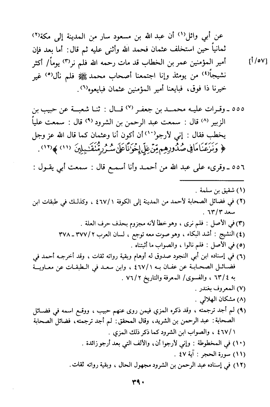 555 - وَقَرَأْتُ عَلَيْهِ: مُحَمَّدُ بْنُ جَعْفَرٍ قَالَ: ثَنَا شُعْبَةُ، عَنْ حَبِيبِ بْنِ الزُّبَيْرِ، قَالَ: سَمِعْتُ عَبْدَ الرَّحْمَنِ بْنَ الشُّرُودِ، قَالَ: سَمِعْتُ عَلِيًّا، يَخْطُبُ، فَقَالَ: " §إِنِّي لَأَرْجُو أَنْ أَكُونَ أَنَا وَعُثْمَانُ كَمَا قَالَ اللَّهُ عَزَّ وَجَلَّ: {وَنَزَعْنَا مَا فِي صُدُورِهِمْ مِنْ غَلٍّ إِخْوَانًا عَلَى سُرُرٍ مُتَقَابِلِينَ} [الحجر: 47] "