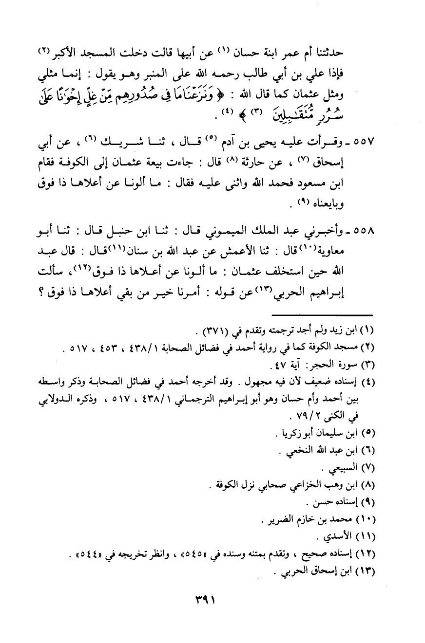 558 - وَأَخْبَرَنِي عَبْدُ الْمَلِكِ الْمَيْمُونِيُّ، قَالَ: ثَنَا ابْنُ حَنْبَلٍ، قَالَ: ثَنَا أَبُو مُعَاوِيَةَ، قَالَ: ثَنَا الْأَعْمَشُ، عَنْ عَبْدِ اللَّهِ بْنِ سِنَانٍ، قَالَ: قَالَ عَبْدُ اللَّهِ حِينَ اسْتُخْلِفَ عُثْمَانُ: «§مَا أَلَوْنَا عَنْ أَعْلَاهَا ذَا فُوقٍ» ، سَأَلْتُ إِبْرَاهِيمَ الْحَرْبِيَّ عَنْ قَوْلِهِ: أَمَّرْنَا خَيْرَ مَنْ بَقِيَ أَعْلَاهَا ذَا فُوقٍ؟ -[392]- فَقَالَ: قَدْ قُلْتُ لِلْمُهَلِّبِ بْنِ أَبِي صُفْرَةَ: مَا مَعْنَاكُمْ، أَعْلَاهَا ذَا فُوقٍ؟ قَالَ: مَا نَعْلَمُ أَنَّ أَحَدًا أَغْلَقَ بَابَهُ عَلَى ابْنَتِي نَبِيٍّ إِلَّا عُثْمَانَ رَحِمَهُ اللَّهُ، ثُمَّ رَجَعْتُ إِلَى مَسْأَلَةِ إِسْحَاقَ، قَالَ أَبُو عَبْدِ اللَّهِ: فَكُلُّ مَنْ قَدَّمَ عَلِيًّا عَلَى عُثْمَانَ فَقَدْ أَزْرَى بِالْمُهَاجِرِينَ وَالْأَنْصَارِ "