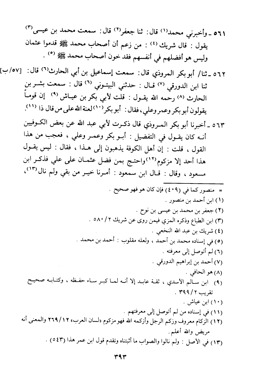 561 - وَأَخْبَرَنِي مُحَمَّدٌ، قَالَ: ثَنَا جَعْفَرٌ، قَالَ: سَمِعْتُ مُحَمَّدَ بْنَ عِيسَى، يَقُولُ: قَالَ شَرِيكٌ: «§مَنْ زَعَمَ أَنَّ أَصْحَابَ مُحَمَّدٍ صَلَّى اللهُ عَلَيْهِ وَسَلَّمَ قَدَّمُوا عُثْمَانَ، وَلَيْسَ هُوَ أَفْضَلَهُمْ فِي أَنْفُسِهِمْ، فَقَدْ خَوَّنَ أَصْحَابَ مُحَمَّدٍ صَلَّى اللهُ عَلَيْهِ وَسَلَّمَ»