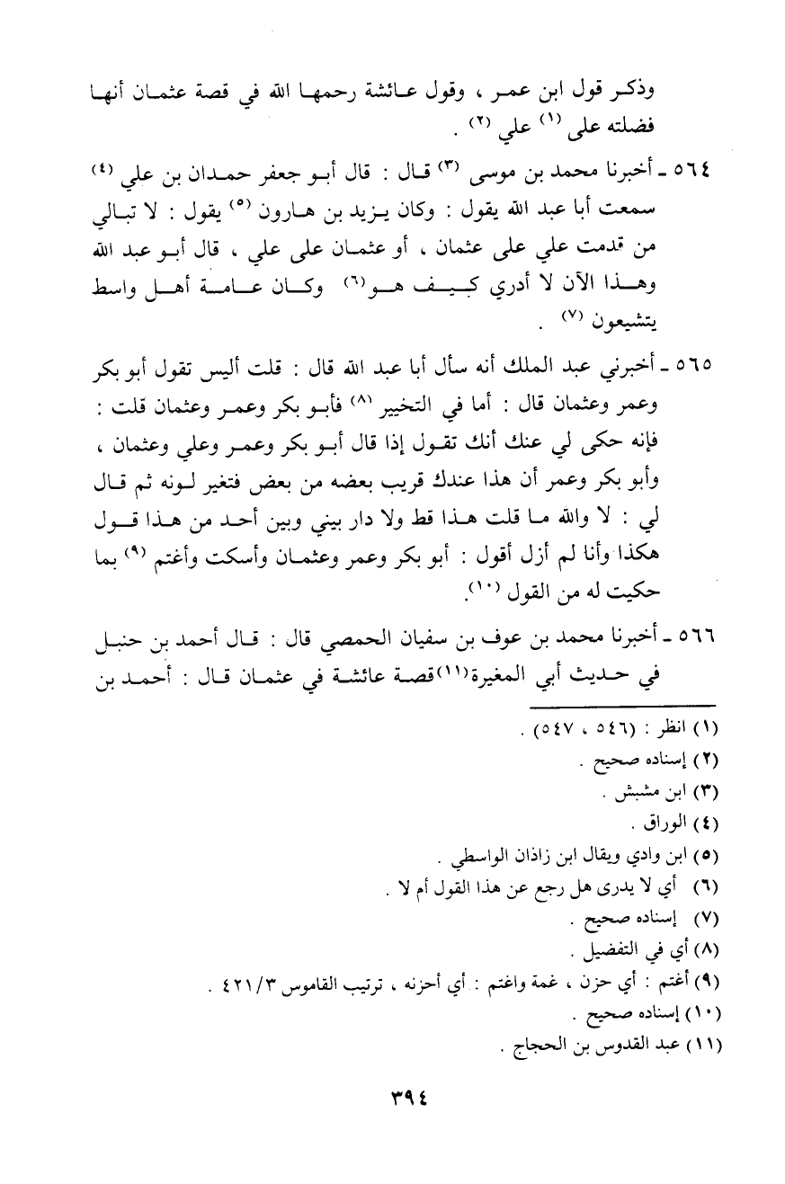 564 - أَخْبَرَنَا مُحَمَّدُ بْنُ مُوسَى، قَالَ: قَالَ أَبُو جَعْفَرٍ حَمْدَانُ بْنُ عَلِيٍّ: سَمِعْتُ أَبَا عَبْدِ اللَّهِ، يَقُولُ: وَكَانَ يَزِيدُ بْنُ هَارُونَ يَقُولُ: " §لَا تُبَالِي مَنْ قَدَّمْتَ، عَلِيٌّ عَلَى عُثْمَانَ، أَوْ عُثْمَانَ عَلَى عَلِيٍّ قَالَ أَبُو عَبْدِ اللَّهِ: وَهَذَا الْآنَ لَا أَدْرِي كَيْفَ هُوَ، وَكَانَ عَامَّةُ أَهْلِ وَاسِطٍ يَتَشَيَّعُونَ "