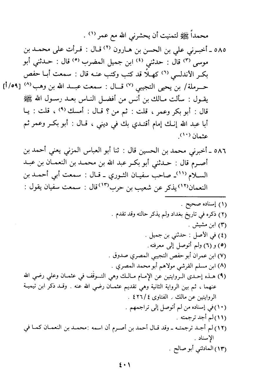 585 - أَخْبَرَنِي عَلِيُّ بْنُ الْحَسَنِ بْنِ هَارُونَ، قَالَ: قَرَأْتُ عَلَى مُحَمَّدِ بْنِ مُوسَى قَالَ: حَدَّثَنِي ابْنُ جَمِيلٍ الْمُضَرِّبُ، قَالَ: حَدَّثَنِي أَبُو بَكْرٍ الْأَنْدَلُسِيُّ كَهْلًا قَدْ كَتَبَ وَكُتِبَ عَنْهُ، قَالَ: سَمِعْتُ أَبَا حَفْصٍ حَرْمَلَةَ بْنَ يَحْيَى التُّجِيبِيَّ قَالَ: سَمِعْتُ عَبْدَ اللَّهِ بْنَ وَهْبٍ يَقُولُ: سَأَلْتُ مَالِكَ بْنَ أَنَسٍ: " مَنْ أَفْضَلُ النَّاسِ بَعْدَ رَسُولِ اللَّهِ صَلَّى اللهُ عَلَيْهِ وَسَلَّمَ؟ قَالَ: أَبُو بَكْرٍ وَعُمَرُ، قُلْتُ: ثُمَّ مَنْ؟ قَالَ: أَمْسِكْ، قُلْتُ: يَا أَبَا عَبْدِ اللَّهِ، §إِنَّكَ إِمَامٌ أَقْتَدِي بِكَ فِي دِينِي، قَالَ: أَبُو بَكْرٍ وَعُمَرُ، ثُمَّ عُثْمَانُ "