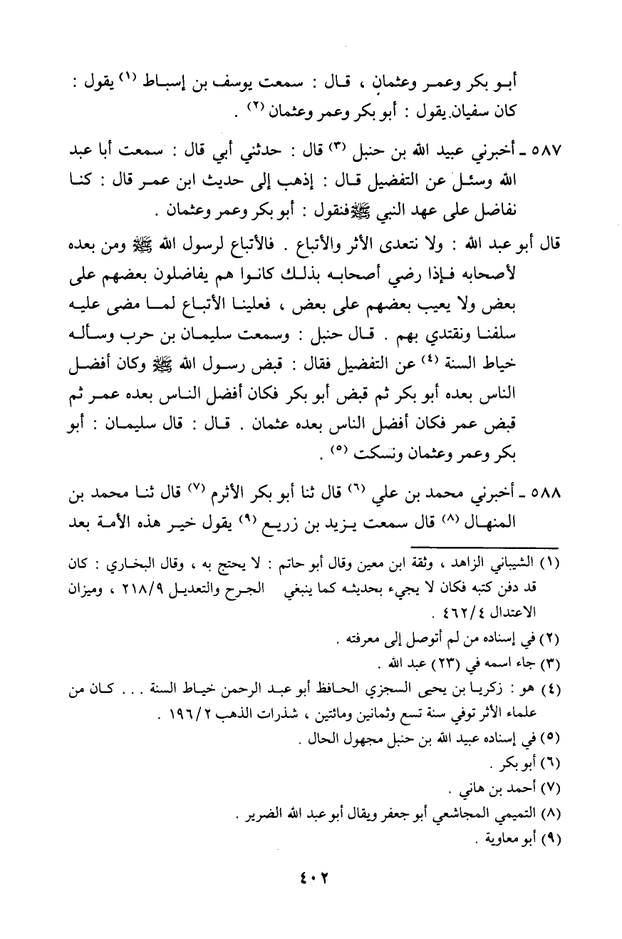 587 - أَخْبَرَنِي عُبَيْدِ اللَّهِ بْنُ حَنْبَلٍ، قَالَ: حَدَّثَنِي أَبِي قَالَ: سَمِعْتُ أَبَا عَبْدِ اللَّهِ وَسُئِلَ عَنِ التَّفْضِيلِ، قَالَ: اذْهَبْ إِلَى حَدِيثِ ابْنِ عُمَرَ، قَالَ: " §كُنَّا نُفَاضِلُ عَلَى عَهْدِ النَّبِيِّ صَلَّى اللهُ عَلَيْهِ وَسَلَّمَ فَنَقُولُ: أَبُو بَكْرٍ وَعُمَرُ وَعُثْمَانُ ". قَالَ أَبُو عَبْدِ اللَّهِ: وَلَا نَتَعَدَّى الْأَثَرَ وَالِاتِّبَاعِ. فَالِاتِّبَاعُ لِرَسُولِ اللَّهِ صَلَّى اللهُ عَلَيْهِ وَسَلَّمَ، وَمِنْ بَعْدِهِ لِأَصْحَابِهِ، فَإِذَا رَضِيَ أَصْحَابُهُ بِذَلِكَ كَانُوا هُمْ يُفَاضِلُونَ بَعْضَهُمْ عَلَى بَعْضٍ، وَلَا يَعِيبُ بَعْضُهُمْ عَلَى بَعْضٍ، فَعَلَيْنَا الِاتِّبَاعُ لِمَا مَضَى عَلَيْهِ سَلَفُنَا، وَنَقْتَدِي بِهِمْ "