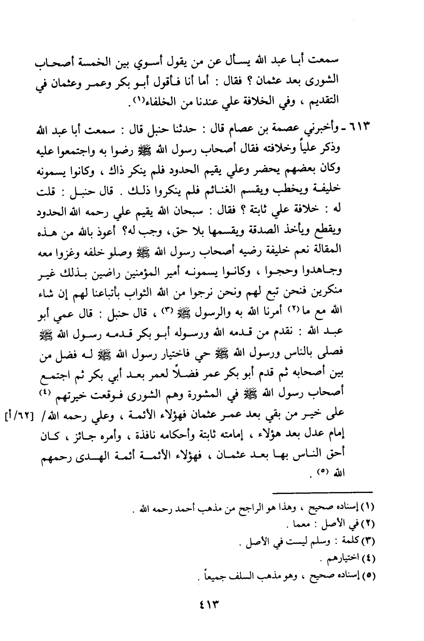 613 - وَأَخْبَرَنِي عِصْمَةُ بْنُ عِصَامٍ، قَالَ: حَدَّثَنَا حَنْبَلٌ، قَالَ: سَمِعْتُ أَبَا عَبْدِ اللَّهِ وَذَكَرَ عَلِيًّا وَخِلَافَتَهُ فَقَالَ: «§أَصْحَابُ رَسُولِ اللَّهِ صَلَّى اللهُ عَلَيْهِ وَسَلَّمَ رَضُوا بِهِ، وَاجْتَمَعُوا عَلَيْهِ، وَكَانَ بَعْضُهُمْ يَحْضُرُ وَعَلِيٌّ يُقِيمُ الْحُدُودَ فَلَمْ يُنْكِرْ ذَاكَ، وَكَانُوا يُسَمُّونَهُ خَلِيفَةً، وَيَخْطُبُ وَيَقَسِمُ الْغَنَائِمَ فَلَمْ يُنْكِرُوا ذَلِكَ» . قَالَ حَنْبَلٌ: قُلْتُ لَهُ: خِلَافَةُ عَلِيٍّ ثَابِتَةٌ؟ فَقَالَ: «سُبْحَانَ اللَّهِ، يُقِيمُ عَلِيٌّ رَحِمَهُ اللَّهُ الْحُدُودَ، وَيَقْطَعُ، وَيَأْخُذُ الصَّدَقَةَ، وَيَقْسِمُهَا بِلَا حَقٍّ وَجَبَ لَهُ؟ أَعُوذُ بِاللَّهِ مِنْ هَذِهِ الْمَقَالَةِ، نَعَمْ خَلِيفَةٌ رَضِيَهُ أَصْحَابُ رَسُولِ اللَّهِ صَلَّى اللهُ عَلَيْهِ وَسَلَّمَ وَصَلَّوْا خَلْفَهُ، وَغَزَوْا مَعَهُ، وَجَاهِدُوا، وَحَجُّوا، وَكَانُوا يُسَمُّونَهُ أَمِيرَ الْمُؤْمِنِينَ رَاضِينَ بِذَلِكَ غَيْرَ مُنْكِرِينَ، فَنَحْنُ تَبَعٌ لَهُمْ، وَنَحْنُ نَرْجُوا مِنَ اللَّهِ الثَّوَابَ بِاتِّبَاعِنَا لَهُمْ إِنْ شَاءَ اللَّهُ، مَعَ مَا أَمَرَنَا اللَّهُ بِهِ وَالرَّسُولُ صَلَّى اللهُ عَلَيْهِ وَسَلَّمَ» . قَالَ حَنْبَلٌ: قَالَ عَمِّي أَبُو عَبْدِ اللَّهِ: «نُقَدِّمُ مَنْ قَدَّمَهُ اللَّهُ وَرَسُولُهُ، أَبُو بَكْرٍ، قَدَّمَهُ رَسُولُ اللَّهِ صَلَّى اللهُ عَلَيْهِ وَسَلَّمَ فَصَلَّى بِالنَّاسِ وَرَسُولُ اللَّهِ صَلَّى اللهُ عَلَيْهِ وَسَلَّمَ حَيُّ، فَاخْتِيَارُ رَسُولِ اللَّهِ صَلَّى اللهُ عَلَيْهِ وَسَلَّمَ لَهُ فَضْلٌ مِنْ بَيْنِ أَصْحَابِهِ، ثُمَّ قَدَّمَ أَبُو بَكْرٍ عُمَرَ فَضْلًا لِعُمَرَ بَعْدَ أَبِي بَكْرٍ، ثُمَّ اجْتَمَعَ أَصْحَابُ رَسُولِ اللَّهِ صَلَّى اللهُ عَلَيْهِ وَسَلَّمَ فِي الْمَشُورَةِ وَهُمُ الشُّورَى فَوَقَعَتْ خِيَرَتُهُمْ عَلَى خَيْرِ مَنْ بَقِيَ بَعْدَ عُمَرَ عُثْمَانَ، فَهَؤُلَاءِ الْأَئِمَّةُ، وَعَلِيٌّ رَحِمَهُ اللَّهُ إِمَامُ عَدْلٍ بَعْدَ هَؤُلَاءِ، إِمَامَتُهُ ثَابِتَةٌ، وَأَحْكَامُهُ نَافِذَةٌ، وَأَمْرُهُ جَائِزٌ، كَانَ أَحَقَّ النَّاسِ بِهَا بَعْدَ عُثْمَانَ، فَهَؤُلَاءِ الْأَئِمَّةُ أَئِمَّةُ الْهُدَى، رَحِمَهُمُ اللَّهُ»