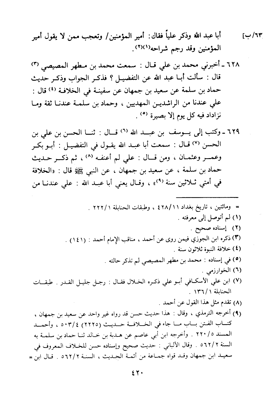 628 - أَخْبَرَنِي مُحَمَّدُ بْنُ عَلِيٍّ، قَالَ: سَمِعْتُ مُحَمَّدَ بْنَ مُطَهَّرٍ الْمِصِّيصِيُّ، قَالَ: سَأَلْتُ أَبَا عَبْدِ اللَّهِ عَنِ التَّفْضِيلِ، فَذَكَرَ الْجَوَابَ، وَذَكَرَ حَدِيثَ حَمَّادِ بْنِ سَلَمَةَ عَنْ سَعِيدِ بْنِ جُمْهَانَ، عَنْ سَفِينَةَ فِي الْخِلَافَةِ، قَالَ: «§عَلِيٌّ عِنْدَنَا مِنَ الرَّاشِدِينَ وَالْمَهْدِيِّينَ، وَحَمَّادُ بْنُ سَلَمَةَ عِنْدَنَا ثِقَةٌ، وَمَا نَزْدَادُ فِيهِ كُلَّ يَوْمٍ إِلَّا بَصِيرَةً»