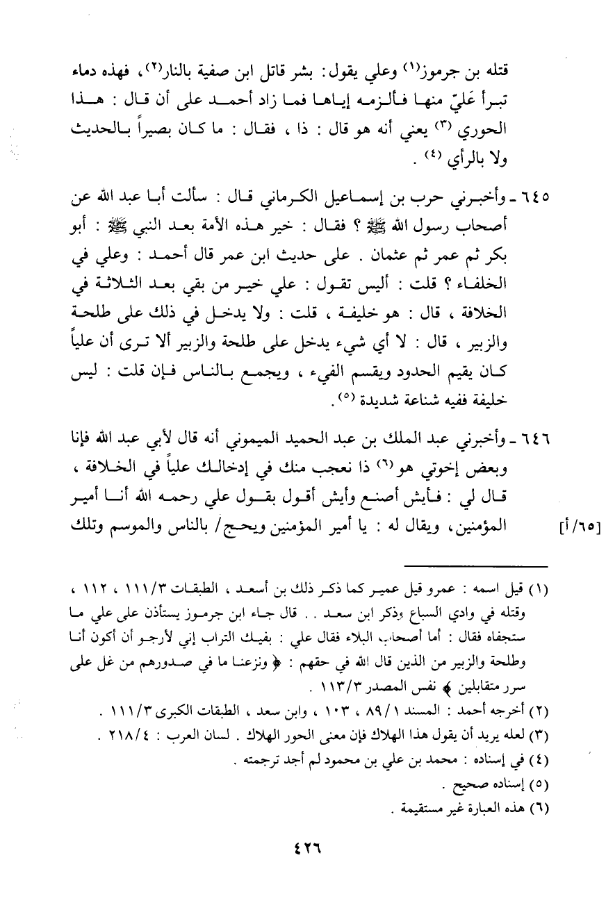 646 - وَأَخْبَرَنِي عَبْدُ الْمَلِكِ بْنُ عَبْدِ الْحَمِيدِ الْمَيْمُونِيُّ، أَنَّهُ قَالَ لِأَبِي عَبْدِ اللَّهِ: فَإِنَّا وَبَعْضُ إِخْوَتِي هُوَ ذَا نَعْجَبُ فِي إِدْخَالِكَ عَلِيًّا فِي الْخِلَافَةِ، قَالَ لِي: " §فَأَيْشِ أَصْنَعُ وَأَيْشِ أَقُولُ بِقَوْلِ عَلِيٍّ رَحِمَهُ اللَّهُ: أَنَا أَمِيرُ الْمُؤْمِنِينَ، وَيُقَالَ لَهُ: يَا أَمِيرَ الْمُؤْمِنِينَ، وَيَحُجُّ بِالنَّاسِ، وَالْمَوْسِمُ، وَتِلْكَ -[427]- الْأَحْكَامُ، وَالصَّلَاةُ بِالنَّاسِ، وَمَا قَطَعَ، وَمَا قَتَلَ، يُتْرَكُ؟ قُلْتُ: فَمَا تَصْنَعُ وَمَا تَقُولُ فِي قِتَالِ طَلْحَةَ وَالزُّبَيْرِ رَحِمَهُمَا اللَّهُ إِيَّاهُ، وَتِلْكَ الدِّمَاءِ؟ قَالَ: مَا لَنَا نَحْنُ وَمَا لِطَلْحَةَ وَالزُّبَيْرِ وَذِكْرِ ذَا، ثُمَّ أَعَادَ عَلَيَّ غَيْرَ مَرَّةٍ: مَا لَنَا نَحْنُ وَمَا لِقِتَالِ هَؤُلَاءِ، وَمَا كَانَ مِنْ تِلْكَ الدِّمَاءِ. وَذَكَرَ حَجَّهُ وَحُكْمَهُ أَيْضًا. قَالَ عَبْدُ الْمَلِكِ: وَهَذَا آخِرُ مَا فَارَقَنِي عَلَيْهِ سَنَةَ سَبْعٍ وَعِشْرِينَ وَنَحْنُ جُلُوسٌ