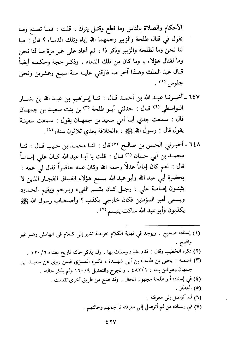 647 - أَخْبَرَنَا عَبْدُ اللَّهِ بْنُ أَحْمَدَ، قَالَ: ثَنَا إِبْرَاهِيمُ بْنُ عَبْدِ اللَّهِ بْنِ بَشَّارٍ الْوَاسِطِيُّ، قَالَ: حَدَّثَنِي أَبُو طَلْحَةَ بْنُ بِنْتِ سَعِيدِ بْنِ جُمْهَانَ، قَالَ: سَمِعْتُ جَدِّيَ أَبَا أُمِّي سَعِيدَ بْنَ جُمْهَانَ يَقُولُ: سَمِعْتُ سَفِينَةَ، يَقُولُ: قَالَ رَسُولُ اللَّهِ صَلَّى اللهُ عَلَيْهِ وَسَلَّمَ: «§الْخِلَافَةُ بَعْدِي ثَلَاثُونَ سَنَةً»