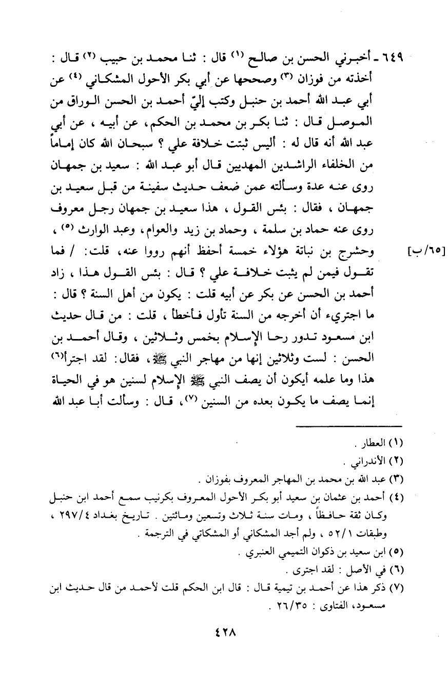649 - أَخْبَرَنِي الْحَسَنُ بْنُ صَالِحٍ،: قَالَ: ثَنَا مُحَمَّدُ بْنُ حَبِيبٍ، قَالَ: أَخَذْتُهُ مِنْ فَوْزَانَ وَصَحَّحَهَا، عَنْ أَبِي بَكْرٍ الْأَحْوَلِ الْمِشْكَانِيِّ، عَنْ أَبِي عَبْدِ اللَّهِ أَحْمَدَ بْنِ حَنْبَلٍ، وَكَتَبَ إِلَيَّ أَحْمَدُ بْنُ الْحَسَنِ الْوَرَّاقُ مِنَ الْمَوْصِلِ قَالَ: ثَنَا بَكْرُ بْنُ مُحَمَّدِ بْنِ الْحَكَمِ، عَنْ أَبِيهِ، عَنْ أَبِي عَبْدِ اللَّهِ، أَنَّهُ قَالَ لَهُ: " أَلَيْسَ تُثْبِتُ خِلَافَةَ عَلِيٍّ؟ سُبْحَانَ اللَّهِ، كَانَ إِمَامًا مِنَ الْخُلَفَاءِ الرَّاشِدِينَ الْمَهْدِيِّينَ. قَالَ أَبُو عَبْدِ اللَّهِ: سَعِيدُ بْنُ جُمْهَانَ رَوَى عَنْهُ عِدَّةٌ، وَسَأَلْتُهُ عَمَّنْ ضَعَّفَ حَدِيثَ سَفِينَةَ مِنْ قِبَلِ سَعِيدِ بْنِ جُمْهَانَ، فَقَالَ: " بِئْسَ الْقَوْلُ هَذَا، سَعِيدُ بْنُ جُمْهَانَ رَجُلٌ مَعْرُوفٌ، رَوَى عَنْهُ حَمَّادُ بْنُ سَلَمَةَ، وَحَمَّادُ بْنُ زَيْدٍ، وَالْعَوَّامُ، وَعَبْدُ الْوَارِثِ، وَحَشْرَجُ بْنُ نُبَاتَةَ، هَؤُلَاءِ خَمْسَةٌ أَحْفَظُ أَنَّهُمْ رَوَوْا عَنْهُ، قُلْتُ: فَمَا تَقُولُ فِيمَنْ لَمْ يُثْبِتْ خِلَافَةَ عَلِيٍّ؟ قَالَ: بِئْسَ الْقَوْلُ هَذَا. زَادَ أَحْمَدُ بْنُ الْحَسَنِ عَنْ بَكْرٍ عَنْ أَبِيهِ: قُلْتُ: يَكُونُ مِنْ أَهْلِ السُّنَّةِ؟ قَالَ: «مَا أَجْتَرِئُ أَنْ أُخْرِجَهُ مِنَ السُّنَّةِ، تَأَوَّلَ فَأَخْطَأَ» ، قُلْتُ: مَنْ قَالَ: حَدِيثُ ابْنِ مَسْعُودٍ: «§تَدُورُ رَحَا الْإِسْلَامِ بِخَمْسٍ وَثَلَاثِينَ» . وَقَالَ أَحْمَدُ بْنُ الْحَسَنِ: لِسِتٍّ وَثَلَاثِينَ، إِنَّهَا مِنْ مُهَاجَرِ النَّبِيِّ صَلَّى اللهُ عَلَيْهِ وَسَلَّمَ، فَقَالَ: لَقَدِ اجْتَرَأَ هَذَا وَمَا عَلِمَهُ، أَيَكُونُ أَنْ يَصِفَ النَّبِيُّ صَلَّى اللهُ عَلَيْهِ وَسَلَّمَ الْإِسْلَامَ لِسِنِينَ هُوَ فِي الْحَيَاةِ، إِنَّمَا يَصِفُ مَا يَكُونُ بَعْدَهُ مِنَ السِّنِينَ