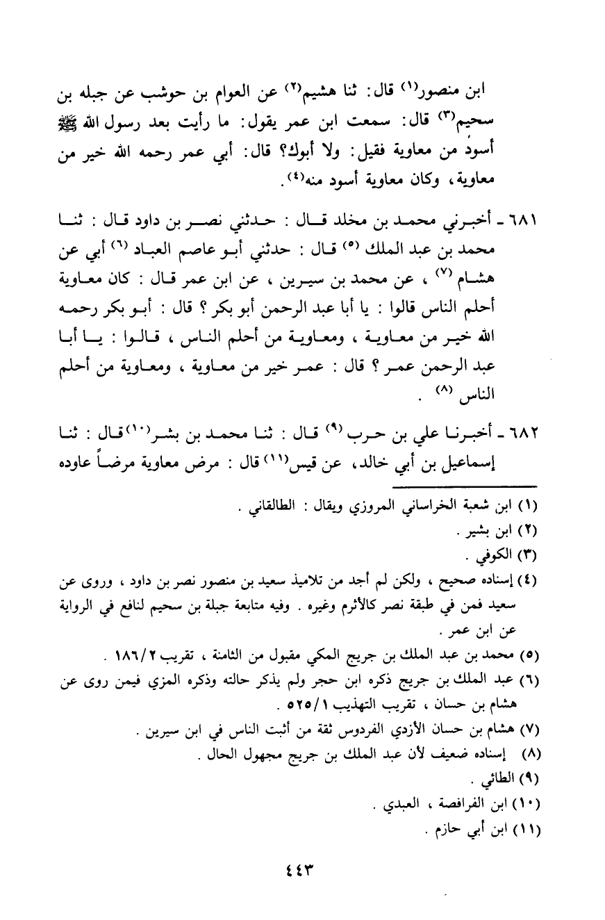 681 - أَخْبَرَنِي مُحَمَّدُ بْنُ مَخْلَدٍ، قَالَ: حَدَّثَنِي نَصْرُ بْنُ دَاوُدَ، قَالَ: ثَنَا مُحَمَّدُ بْنُ عَبْدِ الْمَلِكِ، قَالَ: حَدَّثَنِي أَبُو عَاصِمٍ الْعَبَّادُ أَبِي، عَنْ هِشَامٍ، عَنْ مُحَمَّدِ بْنِ سِيرِينَ، عَنِ ابْنِ عُمَرَ، قَالَ: " §كَانَ مُعَاوِيَةُ أَحْلَمَ النَّاسِ. قَالُوا: يَا أَبَا عَبْدِ الرَّحْمَنِ، أَبُو بَكْرٍ؟ قَالَ: أَبُو بَكْرٍ رَحِمَهُ اللَّهُ خَيْرٌ مِنْ مُعَاوِيَةَ، وَمُعَاوِيَةُ مِنْ أَحْلَمِ النَّاسِ، قَالُوا: يَا أَبَا عَبْدِ الرَّحْمَنِ، عُمَرُ؟ قَالَ: عُمَرُ خَيْرٌ مِنْ مُعَاوِيَةَ، وَمُعَاوِيَةُ مِنْ أَحْلَمِ النَّاسِ "