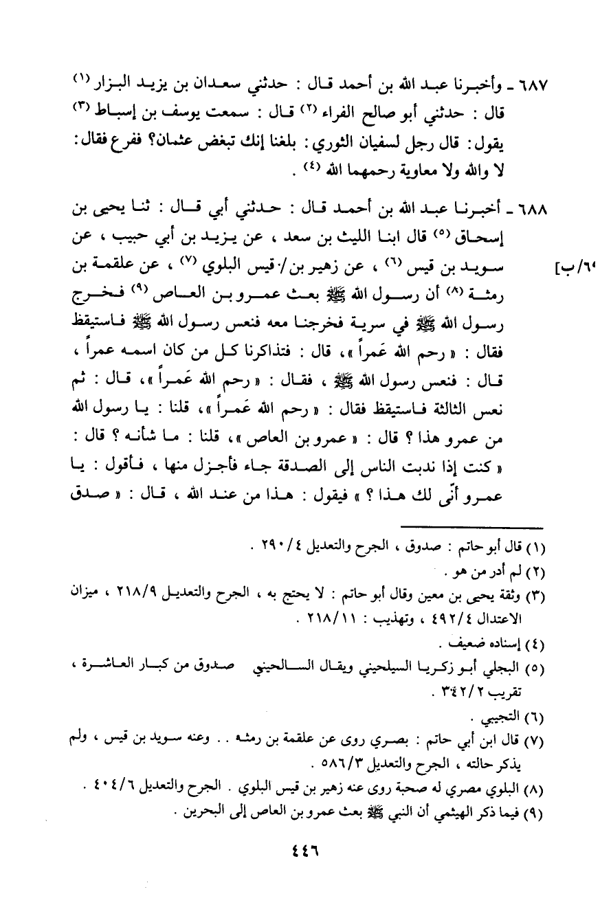 688 - أَخْبَرَنَا عَبْدُ اللَّهِ بْنُ أَحْمَدَ، قَالَ: حَدَّثَنِي أَبِي قَالَ: ثَنَا يَحْيَى بْنُ إِسْحَاقَ، قَالَ: ابنا اللَّيْثُ بْنُ سَعْدٍ، عَنْ يَزِيدَ بْنِ أَبِي حَبِيبٍ، عَنْ سُوَيْدِ بْنِ قَيْسٍ، عَنْ زُهَيْرِ بْنِ قَيْسٍ الْبَلَوِيِّ، عَنْ عَلْقَمَةَ بْنِ رِمْثَةَ، أَنَّ رَسُولَ اللَّهِ صَلَّى اللهُ عَلَيْهِ وَسَلَّمَ بَعَثَ عَمْرَو بْنَ الْعَاصِ، فَخَرَجَ رَسُولُ اللَّهِ صَلَّى اللهُ عَلَيْهِ وَسَلَّمَ فِي سَرِيَّةٍ فَخَرَجْنَا مَعَهُ فَنَعَسَ رَسُولُ اللَّهِ صَلَّى اللهُ عَلَيْهِ وَسَلَّمَ فَاسْتَيْقَظَ، فَقَالَ: «§رَحِمَ اللَّهُ عَمْرًا» قَالَ: فَتَذَاكَرْنَا كُلَّ مَنْ كَانَ اسْمُهُ عَمْرًا، قَالَ: فَنَعَسَ رَسُولُ اللَّهِ صَلَّى اللهُ عَلَيْهِ وَسَلَّمَ فَقَالَ: «رَحِمَ اللَّهُ عَمْرًا» . قَالَ: ثُمَّ نَعَسَ الثَّالِثَةَ فَاسْتَيْقَظَ، فَقَالَ: «رَحِمَ اللَّهُ عَمْرًا» . قُلْنَا: يَا رَسُولَ اللَّهِ، مَنْ عَمْرٌو هَذَا؟ قَالَ: «عَمْرُو بْنُ الْعَاصِ» قُلْنَا: مَا شَأْنُهُ؟ قَالَ: " كُنْتُ إِذَا نَدَبْتُ النَّاسَ إِلَى الصَّدَقَةِ جَاءَ فَأَجْزَلَ مِنْهَا، فَأَقُولُ: يَا عَمْرُو أَنَّى لَكَ هَذَا؟ فَيَقُولُ: هَذَا مِنْ عِنْدِ اللَّهِ ". قَالَ: «صَدَقَ -[447]- عَمْرُو إِنَّ لَهُ عِنْدَ اللَّهِ خَيْرًا كَثِيرًا» . قَالَ زُهَيْرُ بْنُ قَيْسٍ: فَلَمَّا قُبِضَ النَّبِيُّ عَلَيْهِ السَّلَامُ قُلْتُ: لَأَلْزَمَنَّ هَذَا الَّذِي قَالَ رَسُولُ اللَّهِ صَلَّى اللهُ عَلَيْهِ وَسَلَّمَ: «إِنَّ لَهُ عِنْدَ اللَّهِ خَيْرًا كَثِيرًا» حَتَّى أَمُوتَ