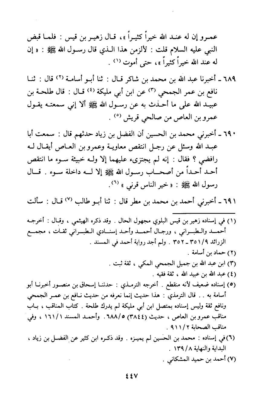 689 - أَخْبَرَنَا عَبْدُ اللَّهِ بْنُ مُحَمَّدِ بْنِ شَاكِرٍ، قَالَ: ثَنَا أَبُو أُسَامَةَ، قَالَ: ثَنَا نَافِعُ بْنُ عُمَرَ الْجُمَحِيُّ، عَنِ ابْنِ أَبِي مُلَيْكَةَ، قَالَ: قَالَ طَلْحَةُ بْنُ عُبَيْدِ اللَّهِ: عَلَى مَا أُحَدِّثُ بِهِ عَنْ رَسُولِ اللَّهِ صَلَّى اللهُ عَلَيْهِ وَسَلَّمَ، أَلَا إِنِّي سَمِعْتُهُ يَقُولُ: «§عَمْرُو بْنُ الْعَاصِ مِنْ صَالِحِي قُرَيْشٍ»
