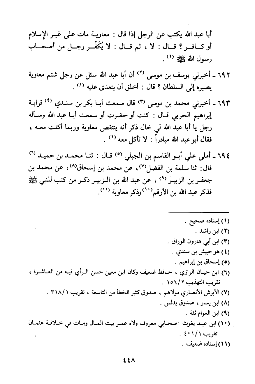 692 - أَخْبَرَنِي يُوسُفُ بْنُ مُوسَى، أَنَّ أَبَا عَبْدِ اللَّهِ سُئِلَ عَنْ رَجُلٍ شَتَمَ مُعَاوِيَةَ، يُصَيِّرُهُ إِلَى السُّلْطَانِ؟ قَالَ: «§أَخْلَقُ أَنْ يُتَعَدَّى عَلَيْهِ»