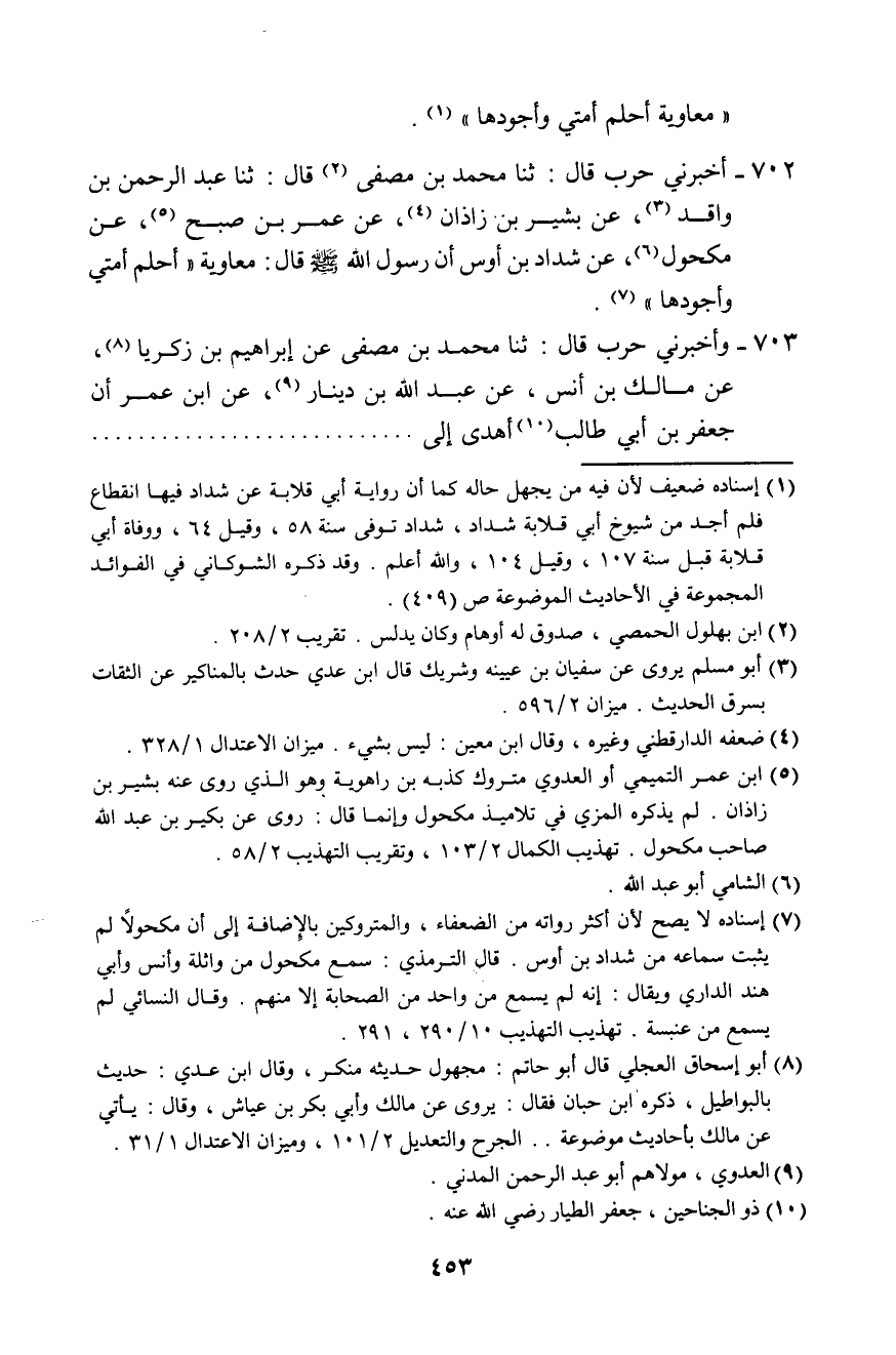 702 - أَخْبَرَنِي حَرْبٌ، قَالَ: ثَنَا مُحَمَّدُ بْنُ مُصَفَّى، قَالَ: ثَنَا عَبْدُ الرَّحْمَنِ بْنُ وَاقِدٍ، عَنْ بَشِيرِ بْنِ زَاذَانَ، عَنْ عُمَرَ بْنِ صُبْحٍ، عَنْ مَكْحُولٍ، عَنْ شَدَّادِ بْنِ أَوْسٍ، أَنَّ رَسُولَ اللَّهِ صَلَّى اللهُ عَلَيْهِ وَسَلَّمَ قَالَ: «§مُعَاوِيَةُ أَحْلَمُ أُمَّتِي وَأَجْوَدُهَا»