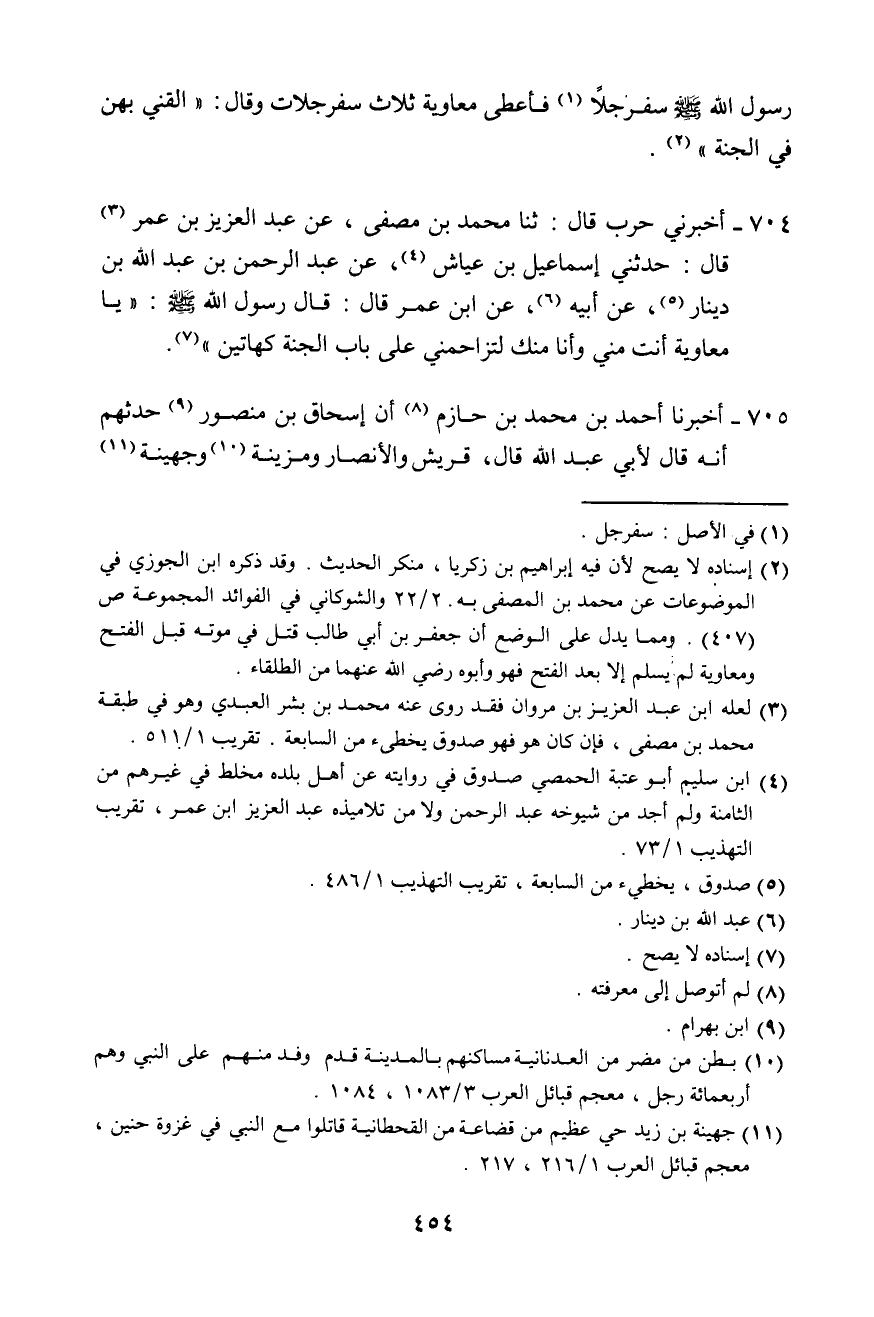 704 - أَخْبَرَنِي حَرْبٌ، قَالَ: ثَنَا مُحَمَّدُ بْنُ مُصَفَّى، عَنْ عَبْدِ الْعَزِيزِ بْنِ عُمَرَ، قَالَ: حَدَّثَنِي إِسْمَاعِيلُ بْنُ عَيَّاشٍ، عَنْ عَبْدِ الرَّحْمَنِ بْنِ عَبْدِ اللَّهِ بْنِ دِينَارٍ، عَنْ أَبِيهِ، عَنِ ابْنِ عُمَرَ، قَالَ: قَالَ رَسُولُ اللَّهِ صَلَّى اللهُ عَلَيْهِ وَسَلَّمَ: «يَا مُعَاوِيَةُ، §أَنْتَ مِنِّي وَأَنَا مِنْكَ، لَتُزَاحِمَنِي عَلَى بَابِ الْجَنَّةِ كَهَاتَيْنِ»