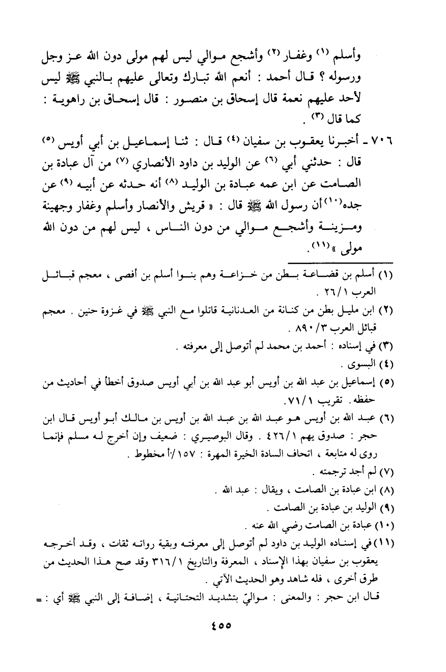 706 - أَخْبَرَنَا يَعْقُوبُ بْنُ سُفْيَانَ، قَالَ: ثَنَا إِسْمَاعِيلُ بْنُ أَبِي أُوَيْسٍ، قَالَ: حَدَّثَنِي أَبِي، عَنِ الْوَلِيدِ بْنِ دَاوُدَ الْأَنْصَارِيِّ مِنْ آلِ عُبَادَةَ بْنِ الصَّامِتِ، عَنِ ابْنِ عَمِّهِ عُبَادَةَ بْنِ الْوَلِيدِ أَنَّهُ حَدَّثَهُ عَنْ أَبِيهِ، عَنْ جَدِّهِ، أَنَّ رَسُولَ اللَّهِ صَلَّى اللهُ عَلَيْهِ وَسَلَّمَ قَالَ: «§قُرَيْشٌ، وَالْأَنْصَارُ، وَأَسْلَمُ، وَغِفَارٌ، وَجُهَيْنَةُ، وَمُزَيْنَةُ، وَأَشْجَعُ، مَوَالِيَّ مِنْ دُونِ النَّاسِ، لَيْسَ لَهُمْ مِنْ دُونِ اللَّهِ مَوْلًى»
