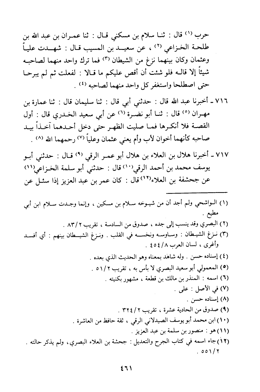 716 - أَخْبَرَنَا عَبْدُ اللَّهِ، قَالَ: حَدَّثَنِي أَبِي قَالَ: ثَنَا سُلَيْمَانُ، قَالَ: ثَنَا عُمَارَةُ بْنُ مِهْرَانَ، قَالَ: ثَنَا أَبُو نَضْرَةَ، عَنْ أَبِي سَعِيدٍ الْخُدْرِيِّ، قَالَ: «§أَوَّلُ الْقِصَّةِ فَلَا أُنْكِرُهَا، فَمَا صَلَّيْتُ الظُّهْرَ حَتَّى دَخَلَ أَحَدُهُمَا آخِذًا بِيَدِ صَاحِبِهِ كَأَنَّهُمَا أَخَوَانِ لِأَبٍ وَأُمٍّ. يَعْنِي عُثْمَانَ وَعَلِيًّا رَحِمَهُمَا اللَّهُ»
