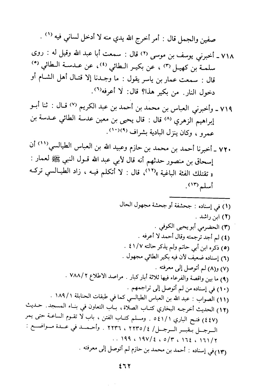 720 - أَخْبَرَنَا أَحْمَدُ بْنُ مُحَمَّدِ بْنِ حَازِمٍ، وَعَبْدُ اللَّهِ بْنُ الْعَبَّاسِ الطَّيَالِسِيُّ، أَنَّ إِسْحَاقَ بْنَ مَنْصُورٍ حَدَّثَهُمْ، أَنَّهُ قَالَ لِأَبِي عَبْدِ اللَّهِ: قَوْلُ النَّبِيِّ صَلَّى اللهُ عَلَيْهِ وَسَلَّمَ لِعَمَّارٍ: «§تَقْتُلُكَ الْفِئَةُ الْبَاغِيَةُ» . قَالَ: «لَا أَتَكَلَّمُ فِيهِ» . زَادَ الطَّيَالِسِيُّ: «تَرْكُهُ أَسْلَمُ»
