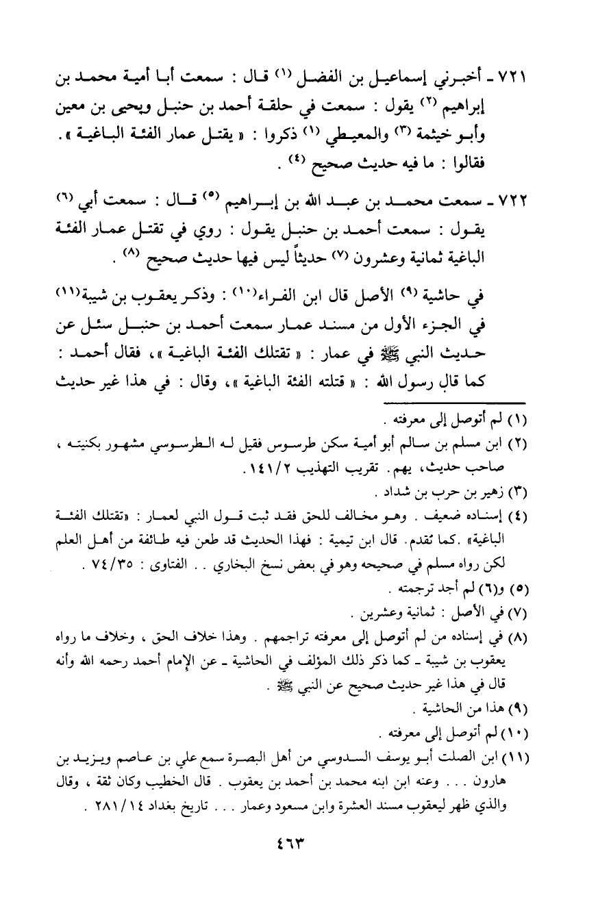 721 - أَخْبَرَنِي إِسْمَاعِيلُ بْنُ الْفَضْلِ، قَالَ: سَمِعْتُ أَبَا أُمَيَّةَ مُحَمَّدَ بْنَ إِبْرَاهِيمَ يَقُولُ: سَمِعْتُ فِي حَلْقَةٍ أَحْمَدَ بْنَ حَنْبَلٍ وَيَحْيَى بْنَ مَعِينٍ وَأَبَا خَيْثَمَةَ وَالْمُعَيْطِيَّ ذَكَرُوا: «§يَقْتُلُ عَمَّارًا الْفِئَةُ الْبَاغِيَةُ» فَقَالُوا: مَا فِيهِ حَدِيثٌ صَحِيحٌ