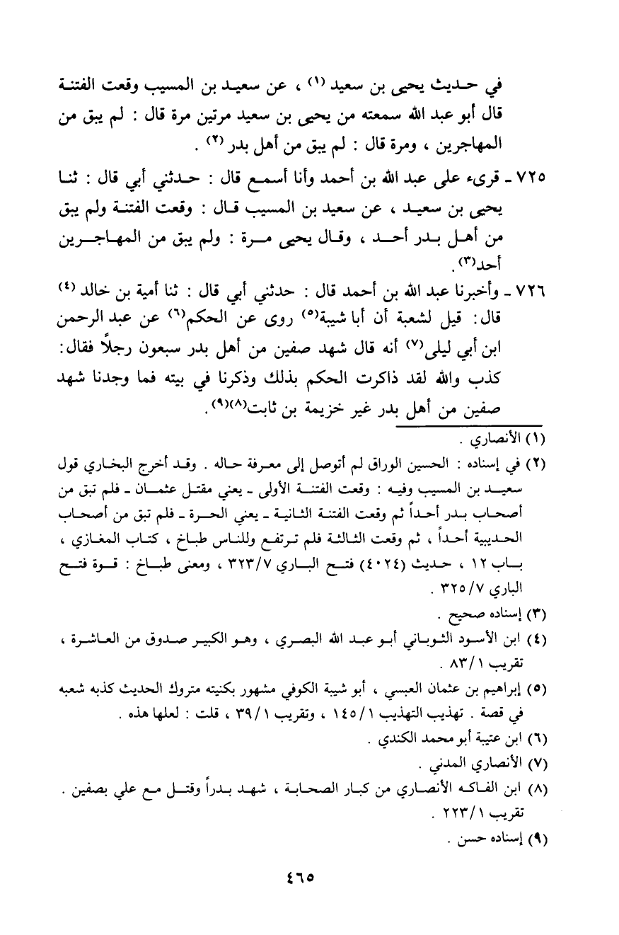 725 - قُرِئَ عَلَى عَبْدِ اللَّهِ بْنِ أَحْمَدَ وَأَنَا أَسْمَعُ، قَالَ: حَدَّثَنِي أَبِي قَالَ: ثَنَا يَحْيَى بْنُ سَعِيدٍ، عَنْ سَعِيدِ بْنِ الْمُسَيِّبِ، قَالَ: " §وَقَعَتِ الْفِتْنَةُ وَلَمْ يَبْقَ مِنْ أَهْلِ بَدْرٍ أَحَدٌ. وَقَالَ يَحْيَى مَرَّةً: وَلَمْ يَبْقَ مِنَ الْمُهَاجِرِينَ أَحَدٌ "
