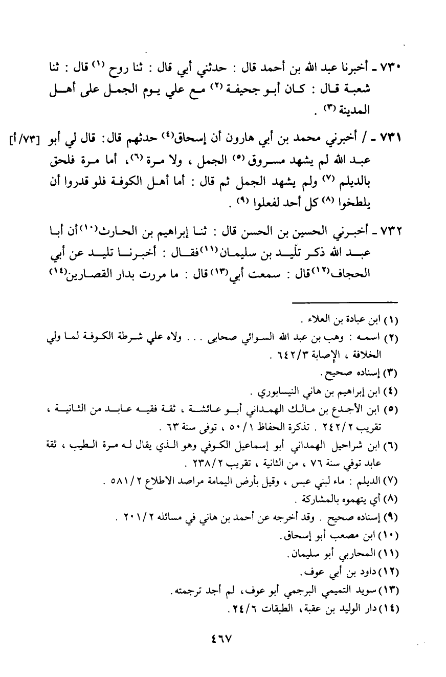 730 - أَخْبَرَنَا عَبْدُ اللَّهِ بْنُ أَحْمَدَ، قَالَ: حَدَّثَنِي أَبِي قَالَ: ثَنَا رَوْحٌ، قَالَ: ثَنَا شُعْبَةُ، قَالَ: «§كَانَ أَبُو جُحَيْفَةَ مَعَ عَلِيٍّ يَوْمَ الْجَمَلِ عَلَىأَهْلِ الْمَدِينَةِ»