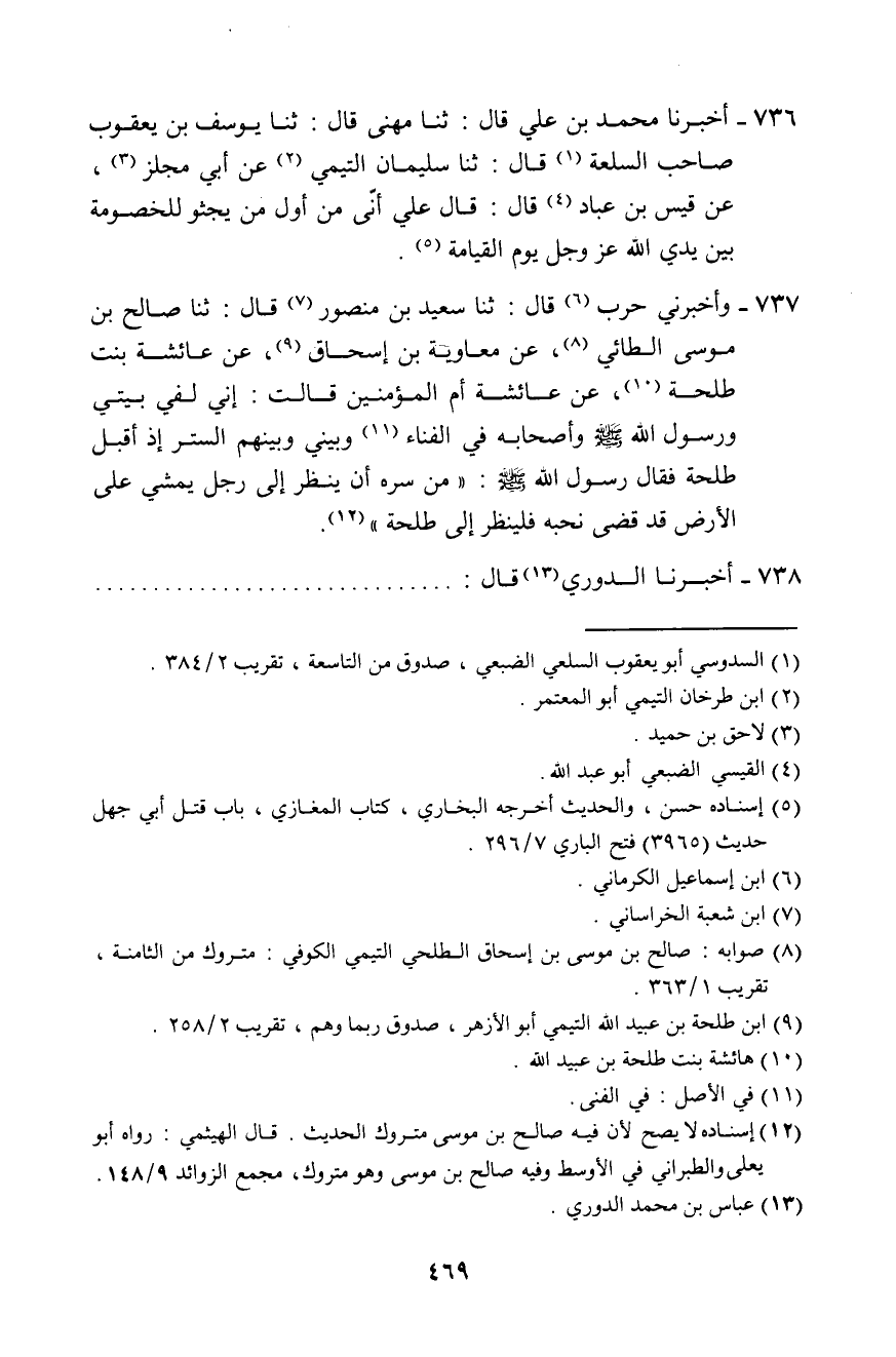 737 - وَأَخْبَرَنِي حَرْبٌ، قَالَ: ثَنَا سَعِيدُ بْنُ مَنْصُورٍ، قَالَ: ثَنَا صَالِحُ بْنُ مُوسَى الطَّائِيُّ، عَنْ مُعَاوِيَةَ بْنِ إِسْحَاقَ، عَنْ عَائِشَةَ بِنْتِ طَلْحَةَ، عَنْ عَائِشَةَ أُمِّ الْمُؤْمِنِينَ، قَالَتْ: إِنِّي لَفِي بَيْتِي، وَرَسُولُ اللَّهِ صَلَّى اللهُ عَلَيْهِ وَسَلَّمَ وَأَصْحَابُهُ فِي الْفِنَاءِ، وَبَيْنِي وَبَيْنَهُمُ السِّتْرُ، إِذْ أَقْبَلَ طَلْحَةُ، فَقَالَ رَسُولُ اللَّهِ صَلَّى اللهُ عَلَيْهِ وَسَلَّمَ: «§مَنْ سَرَّهُ أَنْ يَنْظُرَ إِلَى رَجُلٍ يَمْشِي عَلَى الْأَرْضِ قَدْ قَضَى نَحْبَهُ فَلْيَنْظُرْ إِلَى طَلْحَةَ»