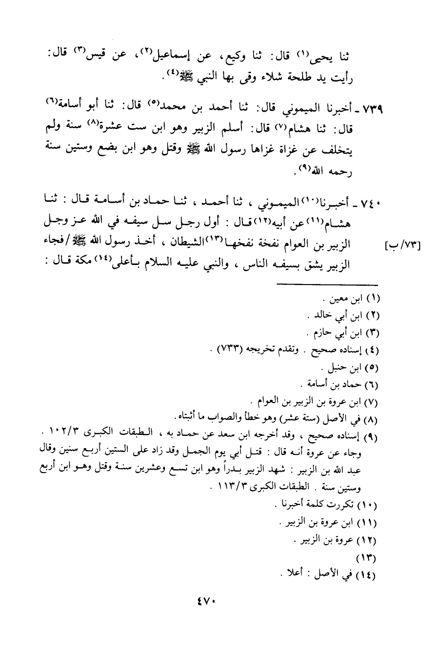739 - أَخْبَرَنَا الْمَيْمُونِيُّ، قَالَ: ثَنَا أَحْمَدُ بْنُ مُحَمَّدٍ، قَالَ: ثَنَا أَبُو أُسَامَةَ، قَالَ: ثَنَا هِشَامٌ، قَالَ: «§أَسْلَمَ الزُّبَيْرُ وَهُوَ ابْنُ سِتَّ عَشْرَةَ سَنَةً، وَلَمْ يَتَخَلَّفْ عَنْ غَزَاةٍ غَزَاهَا رَسُولُ اللَّهِ صَلَّى اللهُ عَلَيْهِ وَسَلَّمَ، وَقُتِلَ وَهُوَ ابْنُ بِضْعٍ وَسِتِّينَ سَنَةً، رَحِمَهُ اللَّهُ»