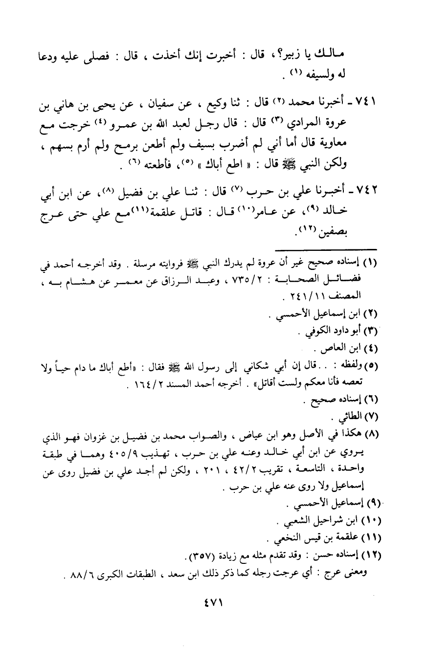 741 - أَخْبَرَنَا مُحَمَّدٌ، قَالَ: ثَنَا وَكِيعٌ، عَنْ سُفْيَانَ، عَنْ يَحْيَى بْنِ هَانِئِ بْنِ عُرْوَةَ الْمُرَادِيِّ، قَالَ: قَالَ رَجُلٌ لِعَبْدِ اللَّهِ بْنِ عَمْرٍو: خَرَجْتَ مَعَ مُعَاوِيَةَ؟، قَالَ: §أَمَا إِنِّي لَمْ أَضْرِبْ بِسَيْفٍ، وَلَمْ أَطْعَنْ بِرُمْحِ، وَلَمْ أَرْمِ بِسَهْمٍ، وَلَكِنَّ النَّبِيَّ صَلَّى اللهُ عَلَيْهِ وَسَلَّمَ قَالَ: «أَطِعْ أَبَاكَ» ، فَأَطَعْتُهُ