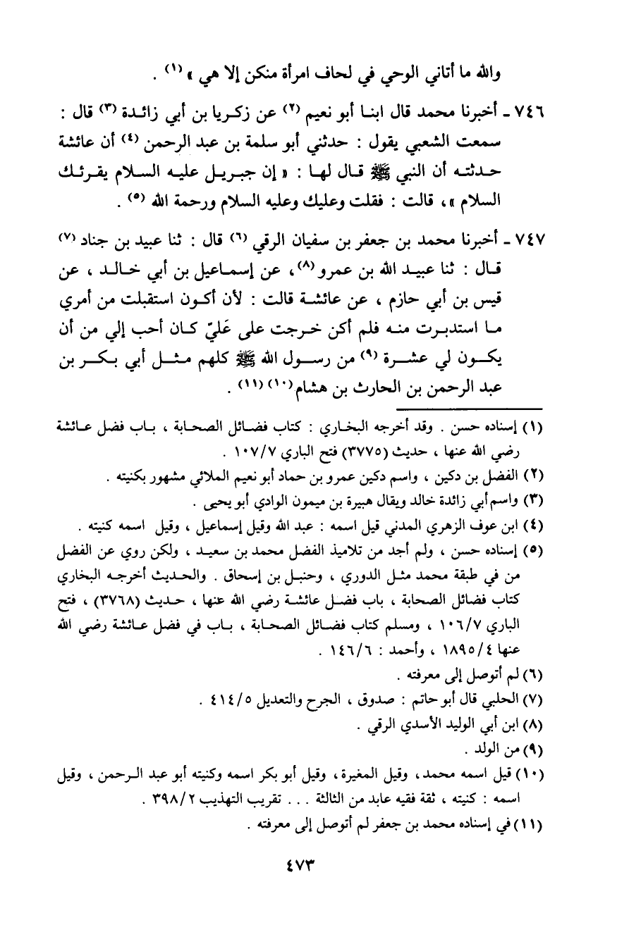 746 - أَخْبَرَنَا مُحَمَّدٌ، قَالَ: ابْنَا أَبُو نُعَيْمٍ عَنْ زَكَرِيَّا بْنِ أَبِي زَائِدَةَ، قَالَ: سَمِعْتُ الشَّعْبِيَّ، يَقُولُ: حَدَّثَنِي أَبُو سَلَمَةَ بْنُ عَبْدِ الرَّحْمَنِ، أَنَّ عَائِشَةَ حَدَّثَتْهُ، أَنَّ النَّبِيَّ صَلَّى اللهُ عَلَيْهِ وَسَلَّمَ قَالَ لَهَا: «§إِنَّ جِبْرِيلَ عَلَيْهِ السَّلَامُ يُقْرِئُكِ السَّلَامَ» . قَالَتْ: فَقُلْتُ: وَعَلَيْكَ وَعَلَيْهِ السَّلَامُ وَرَحْمَةُ اللَّهِ