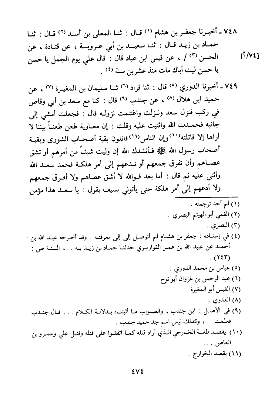749 - أَخْبَرَنَا الدُّورِيُّ، قَالَ: ثَنَا قُرَادٌ، ثَنَا سُلَيْمَانُ بْنُ الْمُغِيرَةِ، عَنْ حُمَيْدِ بْنِ هِلَالٍ، عَنْ جُنْدُبٍ، قَالَ: كُنَّا مَعَ سَعْدِ بْنِ أَبِي وَقَّاصٍ فِي رَكْبٍ فَنَزَلَ سَعْدٌ وَنَزَلْتُ، وَاغْتَنَمْتُ نُزُولَهُ، قَالَ: فَجَعَلْتُ أَمْشِي إِلَى جَانِبِهِ، فَحَمِدْتُ اللَّهَ، وَأَثْنَيْتُ عَلَيْهِ، وَقُلْتُ: إِنَّ مُعَاوِيَةَ طَعَنَ طَعْنَا بَيْنَنَا لَا أُرَاهَا إِلَّا قَاتِلَتُهُ، وَإِنَّ النَّاسَ قَاتِلُونَ بَقِيَّةَ أَصْحَابِ الشُّورَى وَبَقِيَّةَ أَصْحَابِ رَسُولِ اللَّهِ صَلَّى اللهُ عَلَيْهِ وَسَلَّمَ، فَأَنْشُدُكَ اللَّهَ إِنْ وُلِّيتَ شَيْئًا مِنْ أَمْرِهِمْ، أَوْ تَشُقُّ عَصَاهُمْ، وَأَنْ تُفَرِّقَ جَمْعَهُمْ، أَوْ تَدَعَهُمْ إِلَى أَمْرِ هَلَكَةٍ. فَحَمِدَ سَعْدٌ اللَّهَ، وَأَثْنَى عَلَيْهِ، ثُمَّ قَالَ: " أَمَّا بَعْدُ، فَوَاللَّهِ §لَا أَشُقُّ عَصَاهُمْ، وَلَا أُفَرِّقُ جَمْعَهُمْ، وَلَا أَدْعُهُمْ إِلَى أَمْرِ هَلَكَةٍ حَتَّى يَأْتُونِي بِسَيْفٍ. يَقُولُ: يَا سَعْدُ، هَذَا مُؤْمِنٌ -[475]- فَدَعْهُ، وَهَذَا كَافِرٌ فَاقْتُلْهُ ". قَالَ جُنْدُبٌ: فَعَلِمْتُ أَنَّهُ لَا يَدْخُلُ فِي شَيْءٍ مِمَّا غَيْرًا