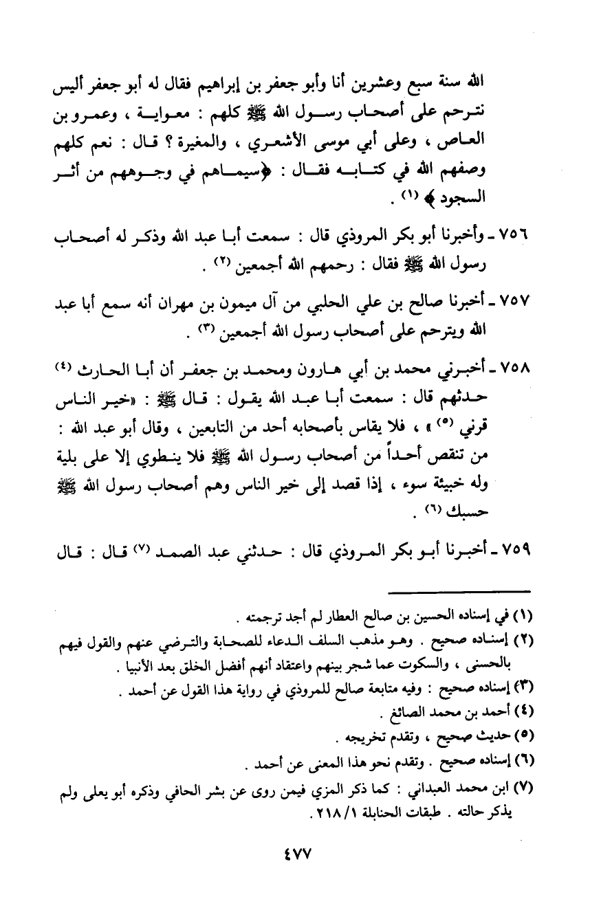 756 - وَأَخْبَرَنَا أَبُو بَكْرٍ الْمَرُّوذِيُّ، قَالَ: سَمِعْتُ أَبَا عَبْدِ اللَّهِ §وَذُكِرَ لَهُ أَصْحَابُ رَسُولِ اللَّهِ صَلَّى اللهُ عَلَيْهِ وَسَلَّمَ، فَقَالَ: «رَحِمَهُمُ اللَّهُ أَجْمَعِينَ»