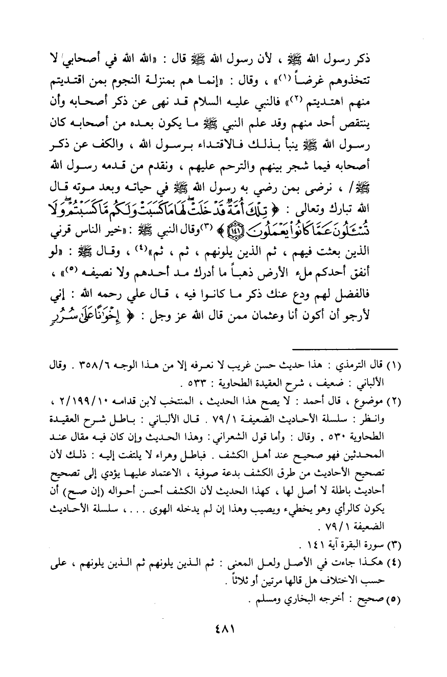 وَقَالَ: «§إِنَّمَا هُمْ بِمَنْزِلَةِ النُّجُومِ، بِمَنِ اقْتَدَيْتُمْ مِنْهُمُ اهْتَدَيْتُمْ» . فَالنَّبِيُّ عَلَيْهِ السَّلَامُ قَدْ نَهَى عَنْ ذِكْرِ أَصْحَابِهِ وَأَنْ يُنْتَقَصَ أَحَدٌ مِنْهُمْ، وَقَدْ عَلِمَ النَّبِيُّ صَلَّى اللهُ عَلَيْهِ وَسَلَّمَ مَا يَكُونُ بَعْدَهُ مِنْ أَصْحَابِهِ. كَانَ رَسُولُ اللَّهِ صَلَّى اللهُ عَلَيْهِ وَسَلَّمَ يُنَبَّأُ بِذَلِكَ، فَالِاقْتِدَاءُ بِرَسُولِ اللَّهِ وَالْكَفُّ عَنْ ذِكْرِ أَصْحَابِهِ فِيمَا شَجَرَ بَيْنَهُمْ وَالتَّرَحُّمُ عَلَيْهِمْ , وَنُقَدِّمُ مَنْ قَدَّمَهُ رَسُولُ اللَّهِ صَلَّى اللهُ عَلَيْهِ وَسَلَّمَ، نَرْضَى بِمَنْ رَضِيَ بِهِ رَسُولُ اللَّهِ صَلَّى اللهُ عَلَيْهِ وَسَلَّمَ فِي حَيَاتِهِ وَبَعْدَ مَوْتِهِ. قَالَ اللَّهُ تَبَارَكَ وَتَعَالَى: {تِلْكَ أُمَّةٌ قَدْ خَلَتْ لَهَا مَا كَسَبَتْ وَلَكُمْ مَا كَسَبْتُمْ وَلَا تُسْأَلُونَ عَمَّا كَانُوا يَعْمَلُونَ} [البقرة: 134]