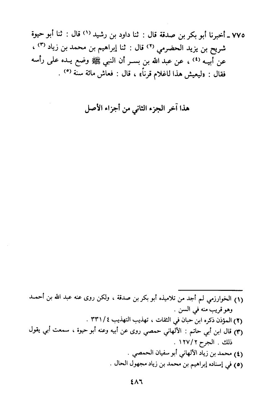 775 - أَخْبَرَنَا أَبُو بَكْرِ بْنُ صَدَقَةَ، قَالَ: ثَنَا دَاوُدُ بْنُ رُشَيْدٍ، قَالَ: ثَنَا أَبُو حَيْوَةَ شُرَيْحُ بْنُ يَزِيدَ الْحَضْرَمِيُّ قَالَ: ثَنَا إِبْرَاهِيمُ بْنُ مُحَمَّدِ بْنِ زِيَادٍ، عَنْ أَبِيهِ، عَنْ عَبْدِ اللَّهِ بْنِ بُسْرٍ، أَنَّ النَّبِيَّ صَلَّى اللهُ عَلَيْهِ وَسَلَّمَ وَضَعَ يَدَهُ عَلَى رَأْسِهِ فَقَالَ: «§لَيَعِيشُ هَذَا الْغُلَامُ قَرْنًا» . قَالَ: فَعَاشَ مِائَةَ سَنَةً
