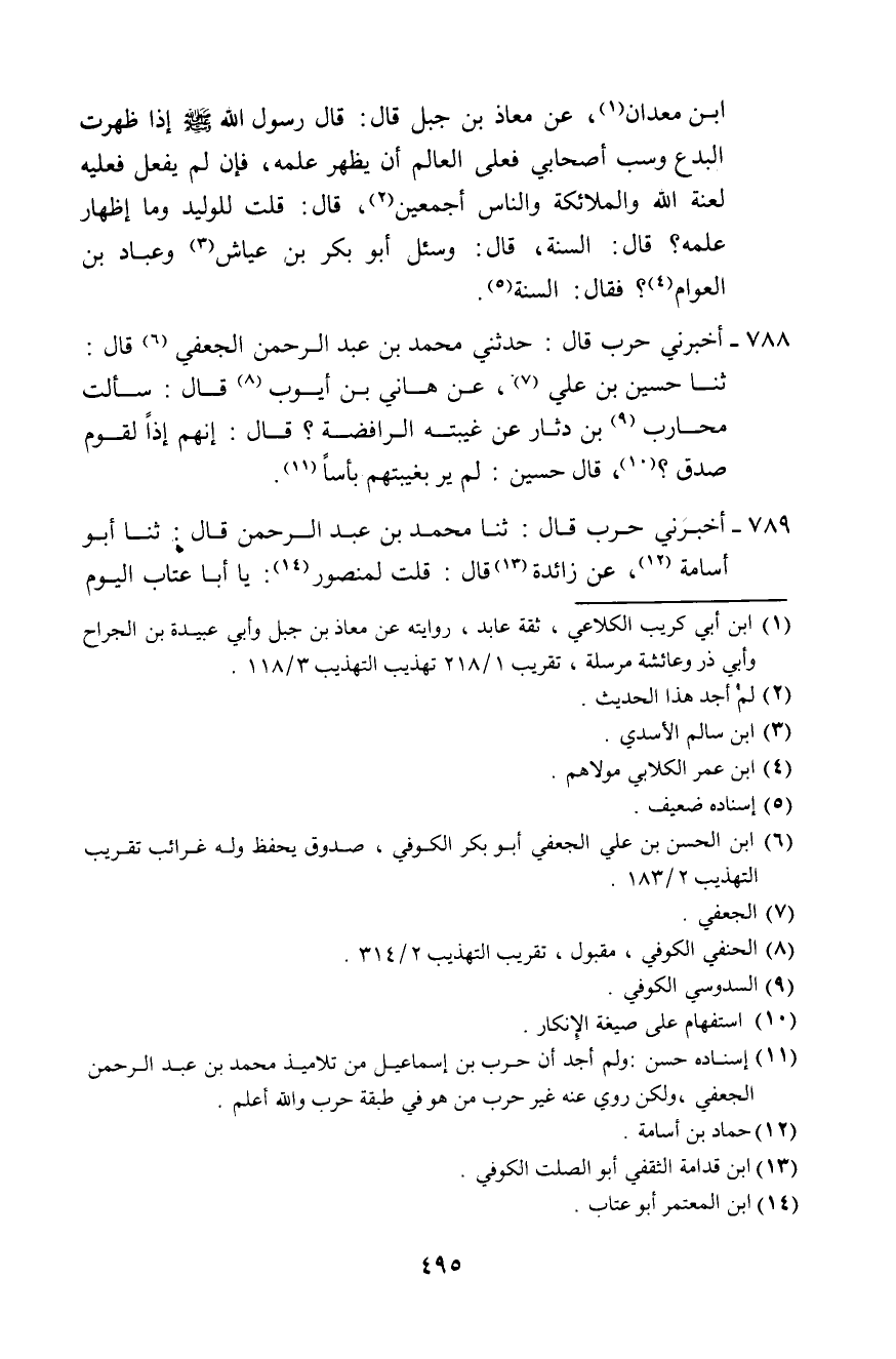 789 - أَخْبَرَنِي حَرْبٌ، قَالَ: ثَنَا مُحَمَّدُ بْنُ عَبْدِ الرَّحْمَنِ، قَالَ: ثَنَا أَبُو أُسَامَةَ، عَنْ زَائِدَةَ، قَالَ: قُلْتُ لِمَنْصُورٍ: " يَا أَبَا عَتَّابٍ، §الْيَوْمَ -[496]- الَّذِي يَصُومُ فِيهِ أَحَدُنَا يَنْتَقِصُ الَّذِينَ يَنْتَقِصُونَ أَبَا بَكْرٍ وَعُمَرَ؟ قَالَ: نَعَمْ "