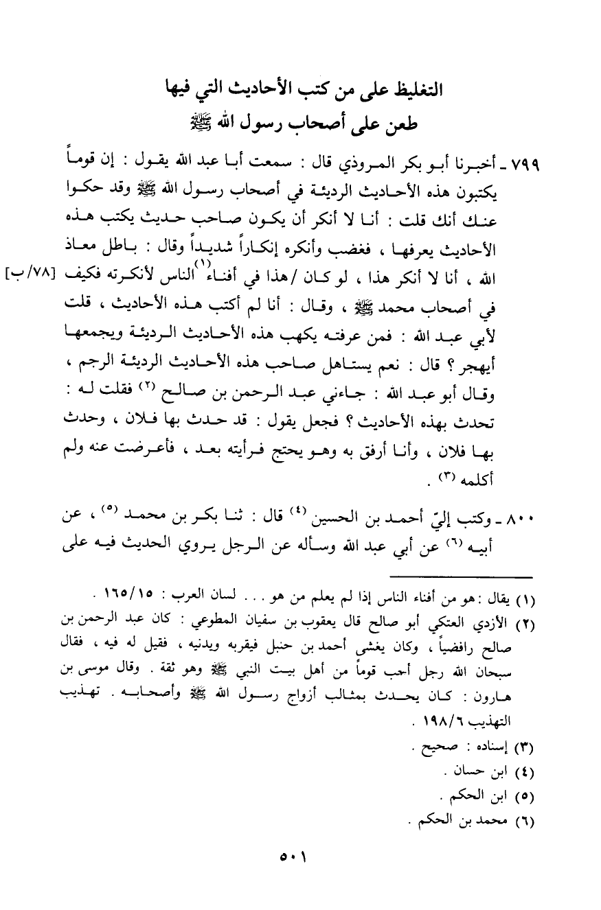 799 - أَخْبَرَنَا أَبُو بَكْرٍ الْمَرُّوذِيُّ، قَالَ: سَمِعْتُ أَبَا عَبْدِ اللَّهِ، يَقُولُ: §إِنَّ قَوْمًا يَكْتُبُونَ هَذِهِ الْأَحَادِيثَ الرَّدِيئَةَ فِي أَصْحَابِ رَسُولِ اللَّهِ صَلَّى اللهُ عَلَيْهِ وَسَلَّمَ، وَقَدْ حَكَوْا عَنْكَ أَنَّكَ قُلْتُ: أَنَا لَا أُنْكِرُ أَنْ يَكُونَ صَاحِبُ حَدِيثٍ يَكْتُبُ هَذِهِ الْأَحَادِيثَ يَعْرِفُهَا، فَغَضِبَ وَأَنْكَرَهُ إِنْكَارًا شَدِيدًا، وَقَالَ: " بَاطِلٌ، مَعَاذَ اللَّهِ، أَنَا لَا أُنْكِرُ هَذَا، لَوْ كَانَ هَذَا فِي أَفْنَاءِ النَّاسِ لَأَنْكَرْتُهُ، كَيْفَ فِي أَصْحَابِ مُحَمَّدٍ صَلَّى اللهُ عَلَيْهِ وَسَلَّمَ، وَقَالَ: أَنَا لَمُ أَكْتُبْ هَذِهِ الْأَحَادِيثَ "، قُلْتُ لِأَبِي عَبْدِ اللَّهِ: فَمَنْ عَرَفْتَهُ يَكْتُبُ هَذِهِ الْأَحَادِيثَ الرَّدِيئَةَ وَيَجْمَعُهَا أَيُهْجَرُ؟ قَالَ: «نَعَمْ، يَسْتَأْهِلُ صَاحِبُ هَذِهِ الْأَحَادِيثِ الرَّدِيئَةِ الرَّجْمَ» ، وَقَالَ أَبُو عَبْدِ اللَّهِ: جَاءَنِي عَبْدُ الرَّحْمَنِ بْنُ صَالِحٍ، فَقُلْتُ لَهُ: تُحَدِّثُ بِهَذِهِ الْأَحَادِيثِ؟ فَجَعَلَ يَقُولُ: قَدْ حَدَّثَ بِهَا فُلَانٌ، وَحَدَّثَ بِهَا فُلَانٌ، وَأَنَا أَرْفُقُ بِهِ، وَهُوَ يَحْتَجُّ، فَرَأَيْتُهُ بَعْدُ فَأَعْرَضْتُ عَنْهُ وَلَمْ أُكَلِّمْهُ "