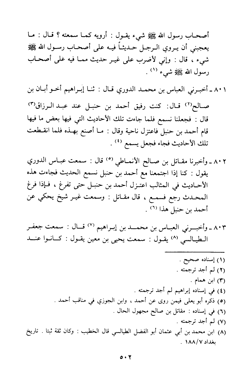802 - وَأَخْبَرَنَا مُقَاتِلُ بْنُ صَالِحٍ الْأَنْمَاطِيُّ، قَالَ: سَمِعْتُ عَبَّاسًا الدُّورِيَّ، يَقُولُ: كُنَّا إِذَا اجْتَمَعْنَا مَعَ أَحْمَدَ بْنِ حَنْبَلٍ نَسْمَعُ الْحَدِيثَ فَجَاءَتْ هَذِهِ الْأَحَادِيثُ فِي الْمَثَالِبِ، §اعْتَزَلَ أَحْمَدُ بْنُ حَنْبَلٍ حَتَّى نَفْرُغَ، فَإِذَا فَرَغَ الْمُحَدِّثُ رَجَعَ فَسَمِعَ، قَالَ مُقَاتِلٌ: وَسَمِعْتُ غَيْرَ شَيْخٍ يَحْكِي عَنْ أَحْمَدَ بْنِ حَنْبَلٍ هَذَا