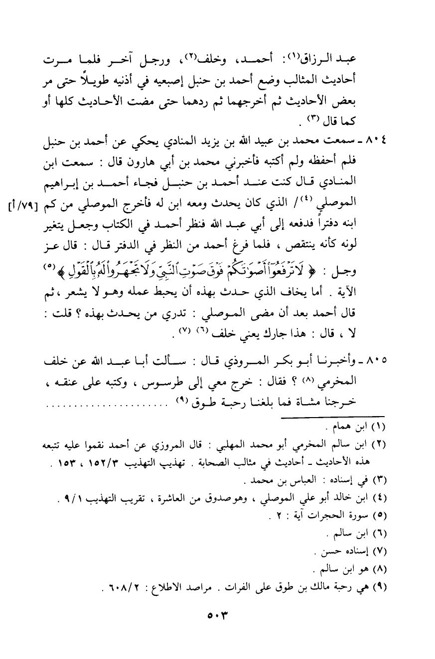 804 - سَمِعْتُ مُحَمَّدَ بْنَ عُبَيْدِ اللَّهِ بْنِ يَزِيدَ الْمُنَادِيَ، يَحْكِي عَنْ أَحْمَدَ بْنِ حَنْبَلٍ، فَلَمْ أَحْفَظْهُ وَلَمْ أَكْتُبْهُ، فَأَخْبَرَنِي مُحَمَّدُ بْنُ أَبِي هَارُونَ، قَالَ: سَمِعْتُ ابْنَ الْمُنَادِي، قَالَ: كُنْتُ عِنْدَ أَحْمَدَ بْنِ حَنْبَلٍ، فَجَاءَ أَحْمَدُ بْنُ إِبْرَاهِيمَ الْمَوْصِلِيُّ الَّذِي كَانَ يُحَدِّثُ وَمَعَهُ ابْنٌ لَهُ، فَأَخْرَجَ الْمَوْصِلِيُّ مِنْ كُمِّ ابْنِهِ دَفْتَرًا فَدَفَعَهُ إِلَى أَبِي عَبْدِ اللَّهِ، فَنَظَرَ أَحْمَدُ فِي الْكِتَابِ وَجَعَلَ يَتَغَيَّرُ لَوْنُهُ كَأَنَّهُ يُنْتَقَصُ، فَلَمَّا فَرَغَ أَحْمَدُ مِنَ النَّظَرِ فِي الدَّفْتَرِ قَالَ: قَالَ عَزَّ وَجَلَّ {لَا تَرْفَعُوا أَصْوَاتَكُمْ فَوْقَ صَوْتِ النَّبِيِّ، وَلَا تَجْهَرُوا لَهُ بِالْقَوْلِ} [الحجرات: 2] الْآيَةَ، §أَمَا يَخَافُ الَّذِي حَدَّثَ بِهَذِهِ أَنْ يَحْبَطَ عَمَلُهُ وَهُوَ لَا يَشْعُرُ، ثُمَّ قَالَ أَحْمَدُ بَعْدَ أَنْ مَضَى الْمَوْصِلِيُّ: تَدْرِي مَنْ يُحَدِّثُ بِهَذِهِ؟ قُلْتُ: لَا. قَالَ: هَذَا جَارُكَ، يَعْنِي خَلَفًا