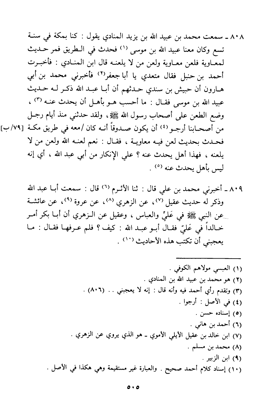 809 - أَخْبَرَنِي مُحَمَّدُ بْنُ عَلِيٍّ، قَالَ: ثَنَا الْأَثْرَمُ، قَالَ: سَمِعْتُ أَبَا عَبْدِ اللَّهِ، وَذُكِرَ لَهُ حَدِيثُ عُقَيْلٍ، عَنِ الزُّهْرِيِّ، عَنْ عُرْوَةَ، عَنْ عَائِشَةَ، عَنِ النَّبِيِّ صَلَّى اللهُ عَلَيْهِ وَسَلَّمَ فِي عَلِيٍّ، وَالْعَبَّاسِ، وَعَقِيلٍ، عَنِ الزُّهْرِيِّ، أَنَّ أَبَا بَكْرٍ أَمَّرَ خَالِدًا فِي عَلِيٍّ، فَقَالَ أَبُو عَبْدِ اللَّهِ: كَيْفَ؟ فَلَمْ يَعْرِفْهَا، فَقَالَ: «§مَا يُعْجِبُنِي أَنْ تُكْتَبَ هَذِهِ الْأَحَادِيثُ»