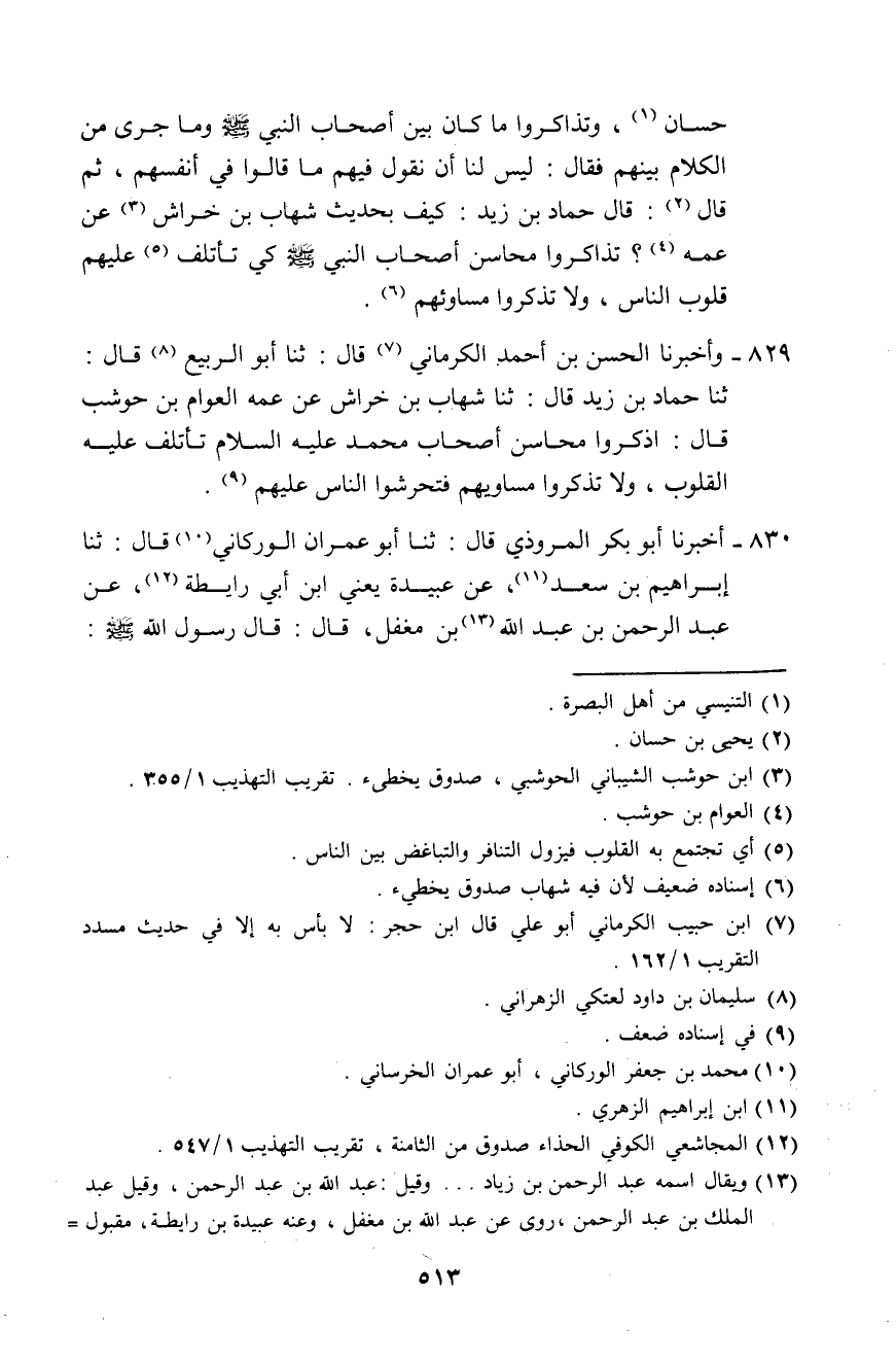 829 - وَأَخْبَرَنَا الْحَسَنُ بْنُ أَحْمَدَ الْكَرْمَانِيُّ، قَالَ: ثَنَا أَبُو الرَّبِيعِ، قَالَ: ثَنَا حَمَّادُ بْنُ زَيْدٍ، قَالَ: ثَنَا شِهَابُ بْنُ خِرَاشٍ، عَنْ عَمِّهِ الْعَوَّامِ بْنِ حَوْشَبٍ، قَالَ: «§اذْكُرُوا مَحَاسِنَ أَصْحَابِ مُحَمَّدٍ عَلَيْهِ السَّلَامُ تَأْتَلِفُ عَلَيْهِ الْقُلُوبُ، وَلَا تَذْكُرُوا مَسَاوِيَهُمْ، فَتُحَرِّشُوا النَّاسَ عَلَيْهِمْ»