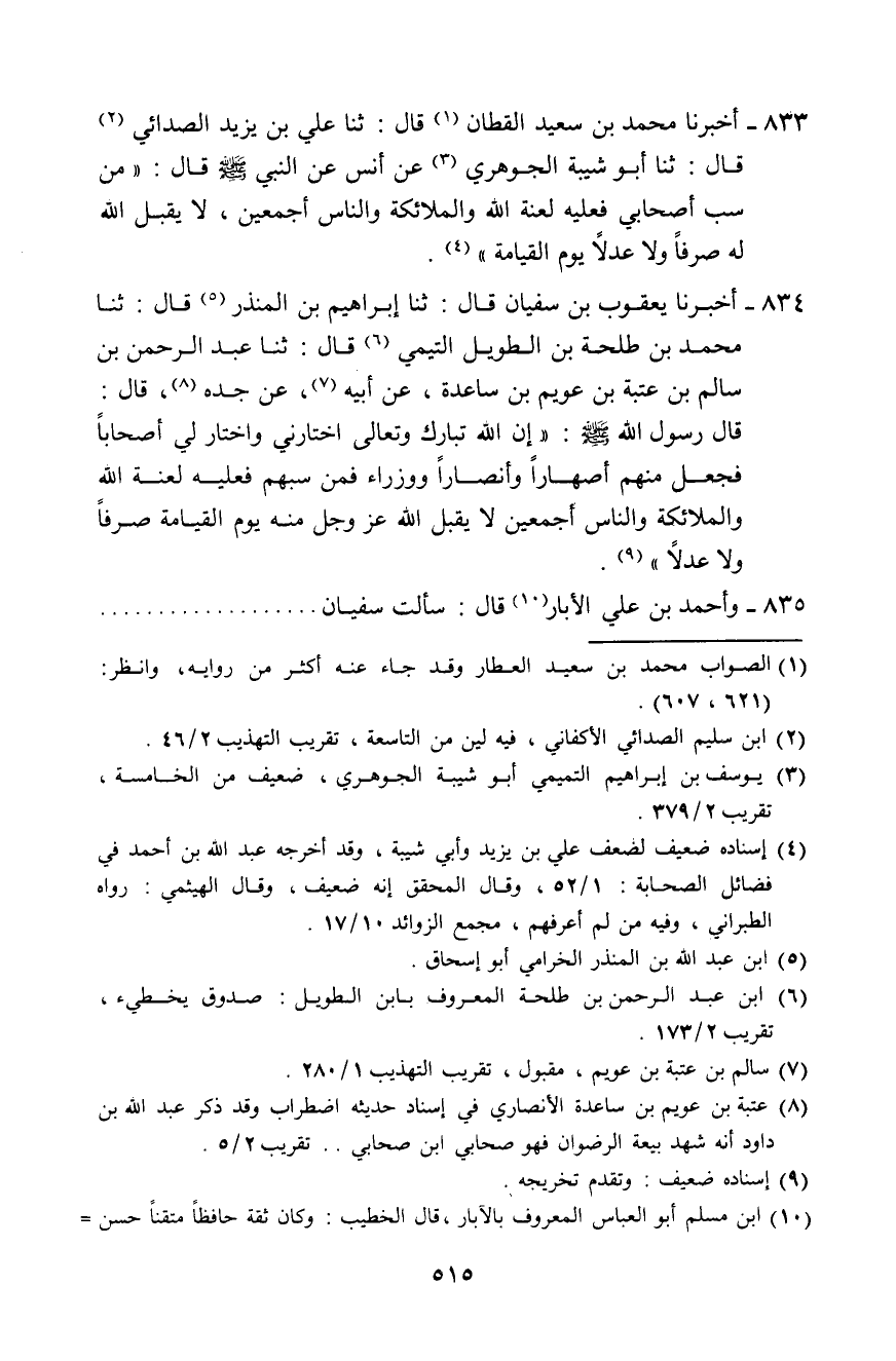 833 - أَخْبَرَنَا مُحَمَّدُ بْنُ سَعِيدٍ الْعَطَّارُ، قَالَ: ثَنَا عَلِيُّ بْنُ يَزِيدَ الصُّدَائِيُّ، قَالَ: ثنا أَبُو شَيْبَةَ الْجَوْهَرِيُّ عَنْ أَنَسٍ، عَنِ النَّبِيِّ صَلَّى اللهُ عَلَيْهِ وَسَلَّمَ قَالَ: «§مَنْ سَبَّ أَصْحَابِي فَعَلَيْهِ لَعْنَةُ اللَّهِ وَالْمَلَائِكَةِ وَالنَّاسِ أَجْمَعِينَ، لَا يَقْبَلُ اللَّهُ لَهُ صَرْفًا، وَلَا عَدْلًا يَوْمَ الْقِيَامَةِ»