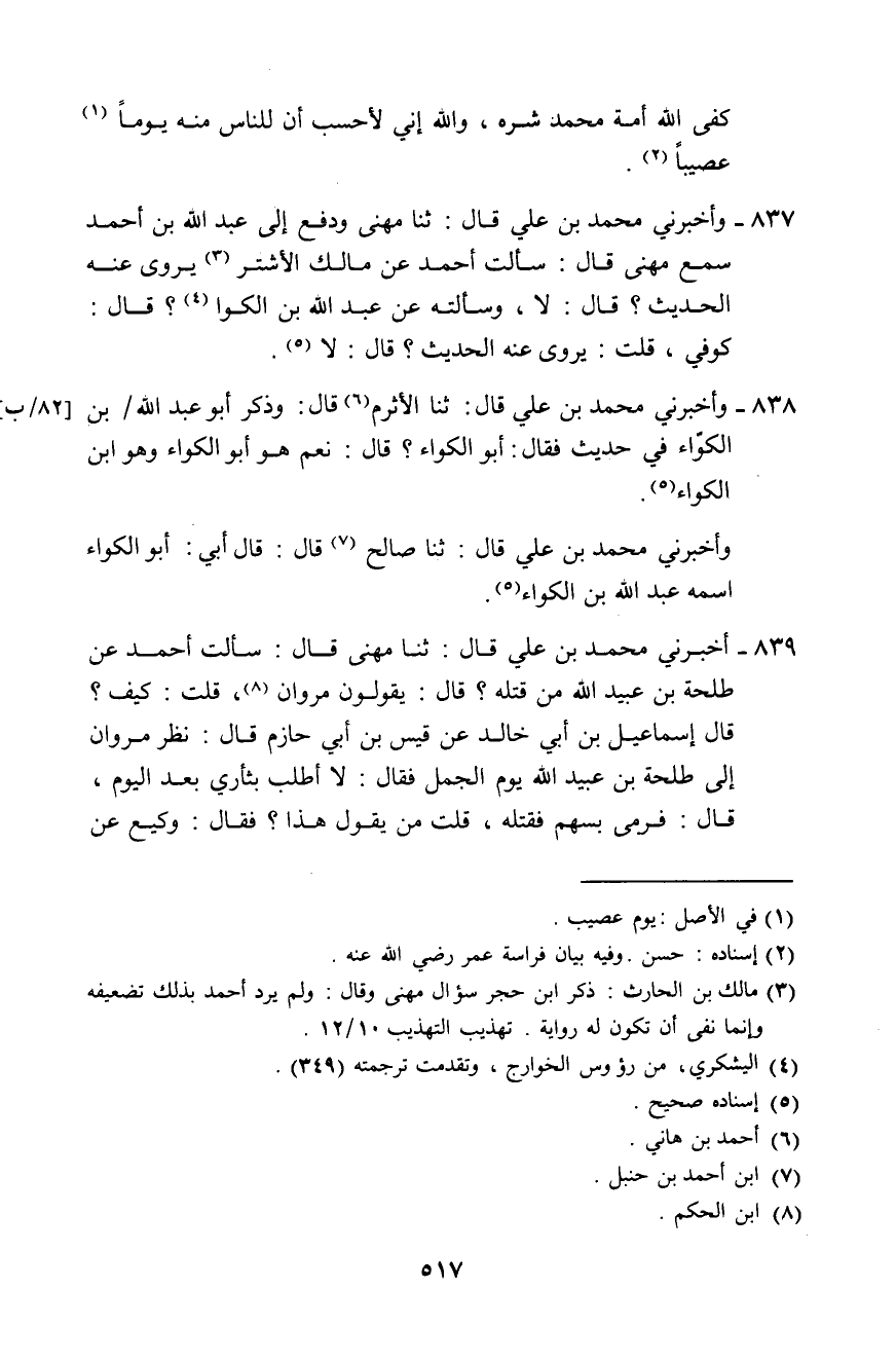839 - أَخْبَرَنِي مُحَمَّدُ بْنُ عَلِيٍّ، قَالَ: ثَنَا مُهَنَّى، قَالَ: سَأَلْتُ أَحْمَدَ عَنْ طَلْحَةَ بْنِ عُبَيْدِ اللَّهِ، مَنْ قَتَلَهُ؟، قَالَ: يَقُولُونَ: مَرْوَانُ، قُلْتُ: كَيْفَ؟ قَالَ إِسْمَاعِيلُ بْنُ أَبِي خَالِدٍ، عَنْ قَيْسِ بْنِ أَبِي حَازِمٍ، قَالَ: نَظَرَ مَرْوَانُ إِلَى طَلْحَةَ بْنِ عُبَيْدِ اللَّهِ يَوْمَ الْجَمَلِ، فَقَالَ: «§لَا أَطْلُبُ بِثَأْرِي بَعْدَ الْيَوْمِ» ، قَالَ: فَرَمَى بِسَهْمٍ فَقَتَلَهُ، قُلْتُ: مَنْ يَقُولُ هَذَا؟ فَقَالَ: وَكِيعٌ عَنْ -[518]- إِسْمَاعِيلَ بْنِ أَبِي خَالِدٍ، قُلْتُ: حَدِّثُونِي، عَنْ عَمْرِو بْنِ مَرْزُوقٍ، عَنْ عِمْرَانَ الْقَطَّانِ، عَنْ قَتَادَةَ، عَنِ الْجَارُودِ بْنِ أَبِي سَبْرَةَ قَالَ: " نَظَرَ مَرْوَانُ إِلَى طَلْحَةَ بْنِ عُبَيْدِ اللَّهِ يَوْمَ الْجَمَلِ، فَقَالَ: لَا أَطْلُبُ بِثَأْرِي بَعْدَ الْيَوْمِ، فَرَمَاهُ بِسَهْمٍ فَقَتَلَهُ "، فَقَالَ: مَا أَدْرِي