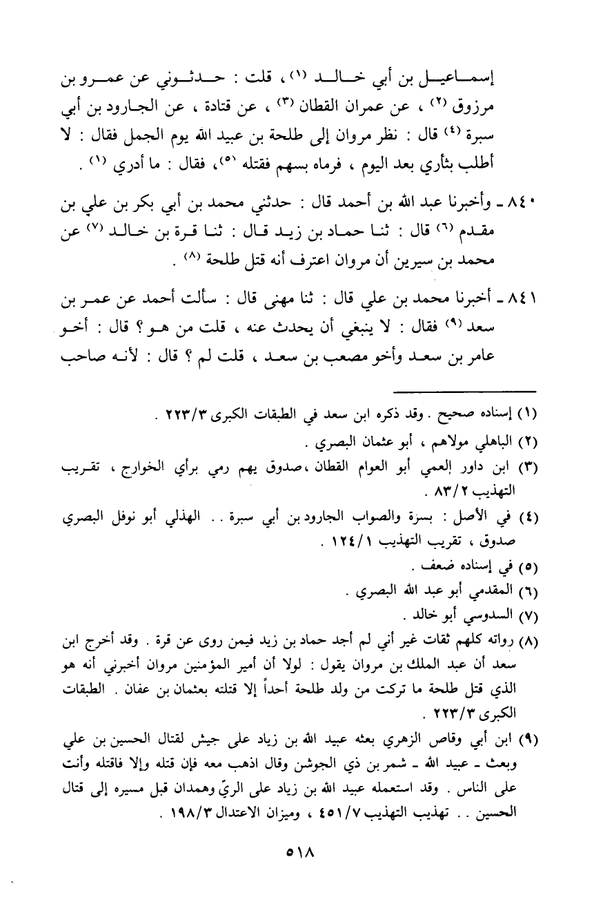 840 - وَأَخْبَرَنَا عَبْدُ اللَّهِ بْنُ أَحْمَدَ، قَالَ: حَدَّثَنِي مُحَمَّدُ بْنُ أَبِي بَكْرِ بْنِ عَلِيِّ بْنِ مُقَدَّمٍ، قَالَ: ثَنَا حَمَّادُ بْنُ زَيْدٍ، قَالَ: ثَنَا قُرَّةُ بْنُ خَالِدٍ، عَنْ مُحَمَّدِ بْنِ سِيرِينَ، أَنَّ مَرْوَانَ §اعْتَرَفَ أَنَّهُ قَتَلَ طَلْحَةَ