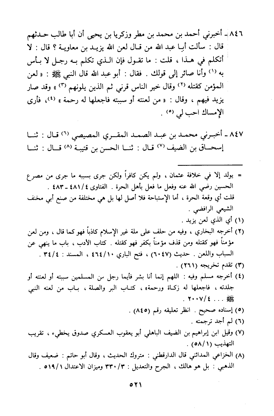 846 - أَخْبَرَنِي أَحْمَدُ بْنُ مُحَمَّدِ بْنِ مَطَرٍ، وَزَكَرِيَّا بْنُ يَحْيَى، أَنَّ أَبَا طَالِبٍ حَدَّثَهُمْ قَالَ: سَأَلْتُ أَبَا عَبْدِ اللَّهِ: مَنْ قَالَ: لَعَنَ اللَّهُ يَزِيدَ بْنِ مُعَاوِيَةَ؟ قَالَ: لَا أَتَكَلَّمُ فِي هَذَا "، قُلْتُ: مَا تَقُولُ؟ فَإِنَّ الَّذِي تَكَلَّمَ بِهِ رَجُلٌ لَا بَأْسَ بِهِ، وَأَنَا صَائِرٌ إِلَى قَوْلِكَ. قَالَ أَبُو عَبْدِ اللَّهِ: قَالَ النَّبِيُّ صَلَّى اللهُ عَلَيْهِ وَسَلَّمَ: «§لَعْنُ الْمُؤْمِنِ كَقَتْلِهِ» وَقَالَ: «خَيْرُ النَّاسِ قَرْنِي، ثُمَّ الَّذِينَ يَلُونَهُمْ» ، وَقَدْ صَارَ يَزِيدُ فِيهِمْ، وَقَالَ: «مَنْ لَعَنْتَهُ أَوْ سَبَبْتَهُ فَاجْعَلْهَا لَهُ رَحْمَةً» ، فَأَرَى الْإِمْسَاكَ أَحَبُّ لِي
